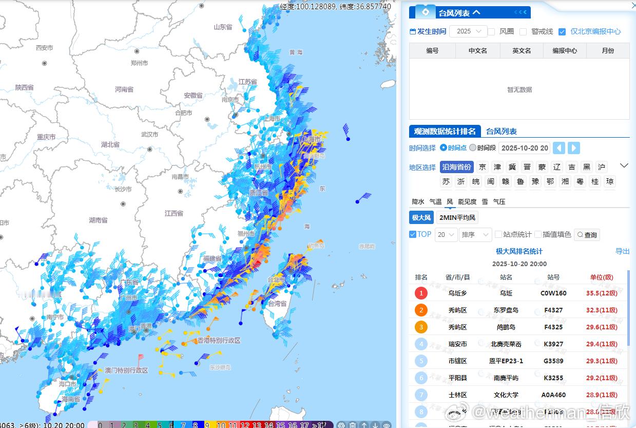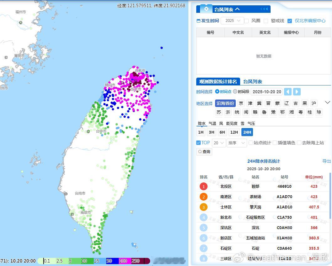 台风风神 今天因为台风风神和冷空气影响,台湾北部出现特大暴雨,鞍部降水量423毫米。此外南港区、士林区、新北市局地雨量也超400毫米。从大风实况看,浙江沿海和福建沿海局地阵风11-12级。今晚到明天,风雨的影响还会持续。