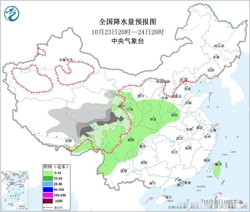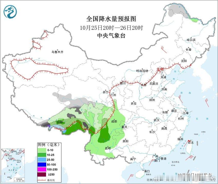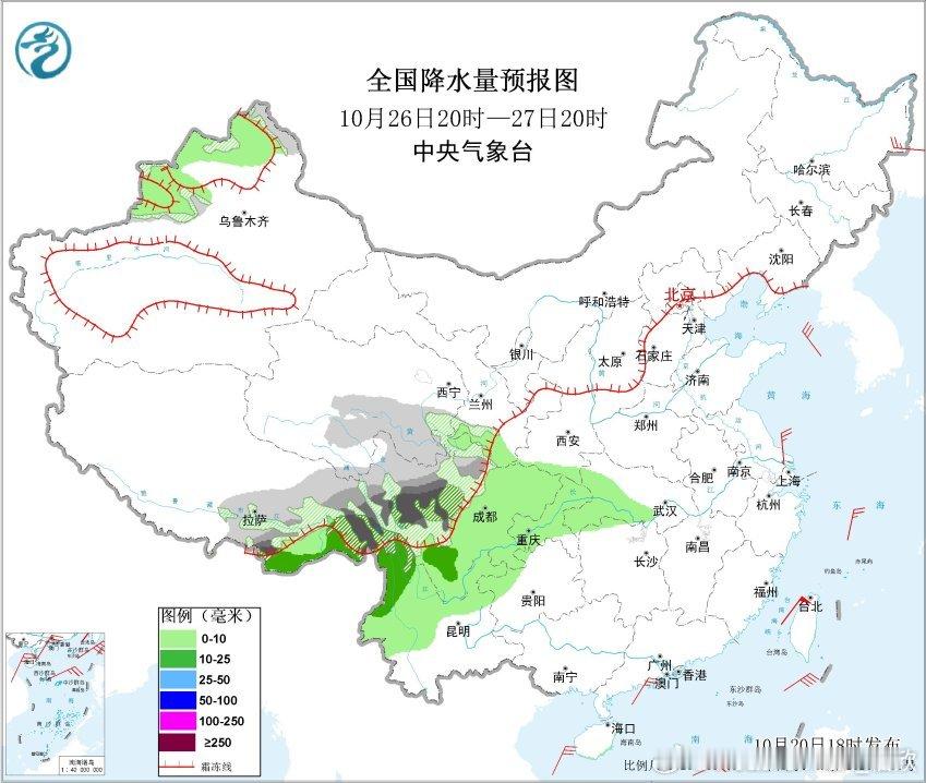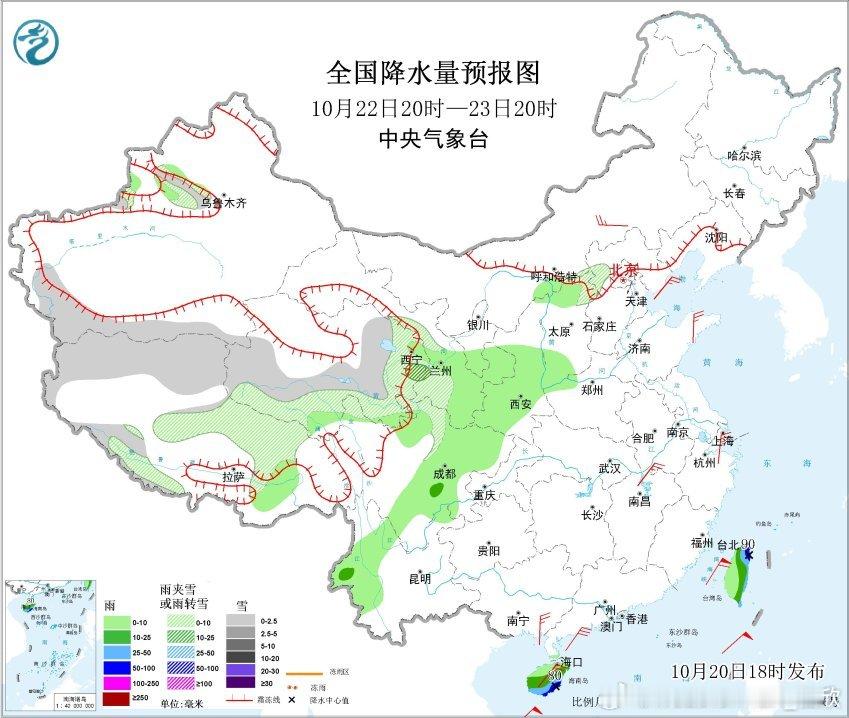 预计,10月22日20时至23日20时,新疆沿天山地区、西藏北部和西部、青海南部和东部、甘肃西南部、河北西部、山西东北部等地部分地区有小雪或雨夹雪。四川盆地西南部、云南西部、海南岛、台湾岛中东部等地部分地区有中到大雨,其中,海南岛东南部、台湾岛东北部等地部分地区有暴雨(50~90毫米)。
