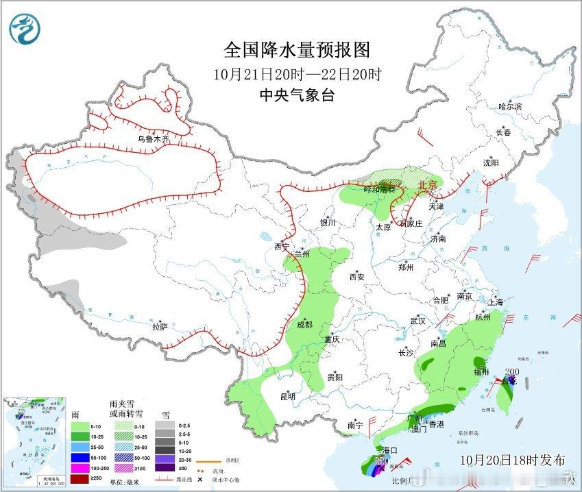 预计,10月20日20时至21日20时,新疆南疆西南部等地部分地区有小雪或雨夹雪。江南中东部和南部、云南东北部、广东东南部沿海、海南岛东部、台湾岛大部等地部分地区有中到大雨,其中,海南岛东北部、台湾岛北部等地部分地区有暴雨或大暴雨(100~250毫米)。