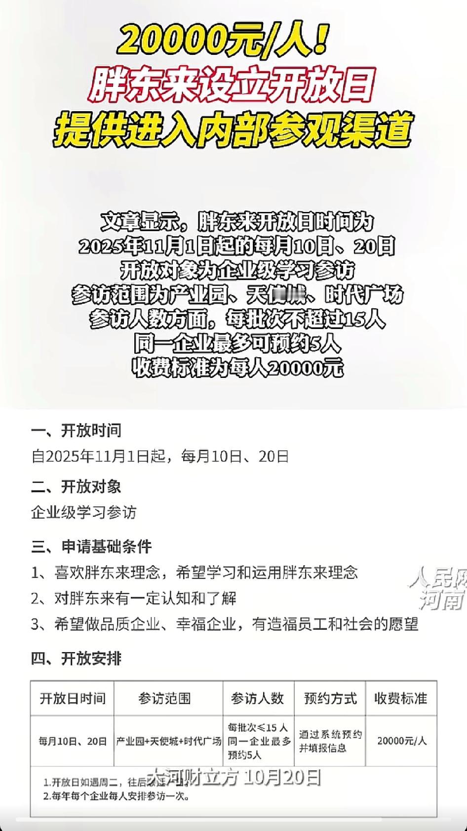 胖东来设立企业开放日,提供其他企业进胖东来学习机会,来参观的人每人需要交纳20000元人民币,同一个企业每年只能来一次,最多才能来5人,也就是10万元,每一批次最多三个企业参观,参观人数限定在15人以内,也就是30万元。 有人认为胖东来是飘了,我认为,确实应该设计胖东来开放日。最主要的原因是给那些真正想改善经营的超市企业一个门槛,建立一种简单有效的筛选机制,而不是让一些企业借着免费参观的名义来旅游,既浪费胖东来人力物力,更没有让胖东来理念落地。另外,企业开放日的设立,意味着企业参观纳入胖东来门店员工的工作内容,不会因为一次突然造访造成人员慌乱。最后,胖东来又增加一项收入给员工发工资了。