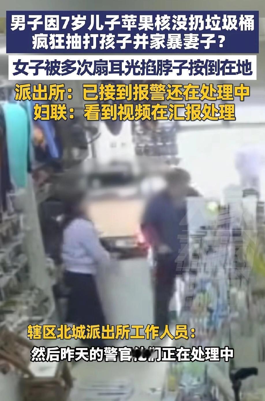 有些父亲不配为人父 仅仅是一个苹果核没扔进垃圾桶, 就疯狂抽打一个才7岁的孩子,母亲见状上前想护着孩子,又遭到丈夫一顿毒打,事发后女子报警。 从监控画面可以看出,爸爸把妈妈摁倒后又是掐脖子,又是扇耳光,孩子在后面不停地想阻拦爸爸,可是他太小了,有心却力不足。 值得庆幸的是他还有个爱他的妈妈,目前警方介入,后续有需要妇联也会协助,希望所有女性对这种家暴零容忍。