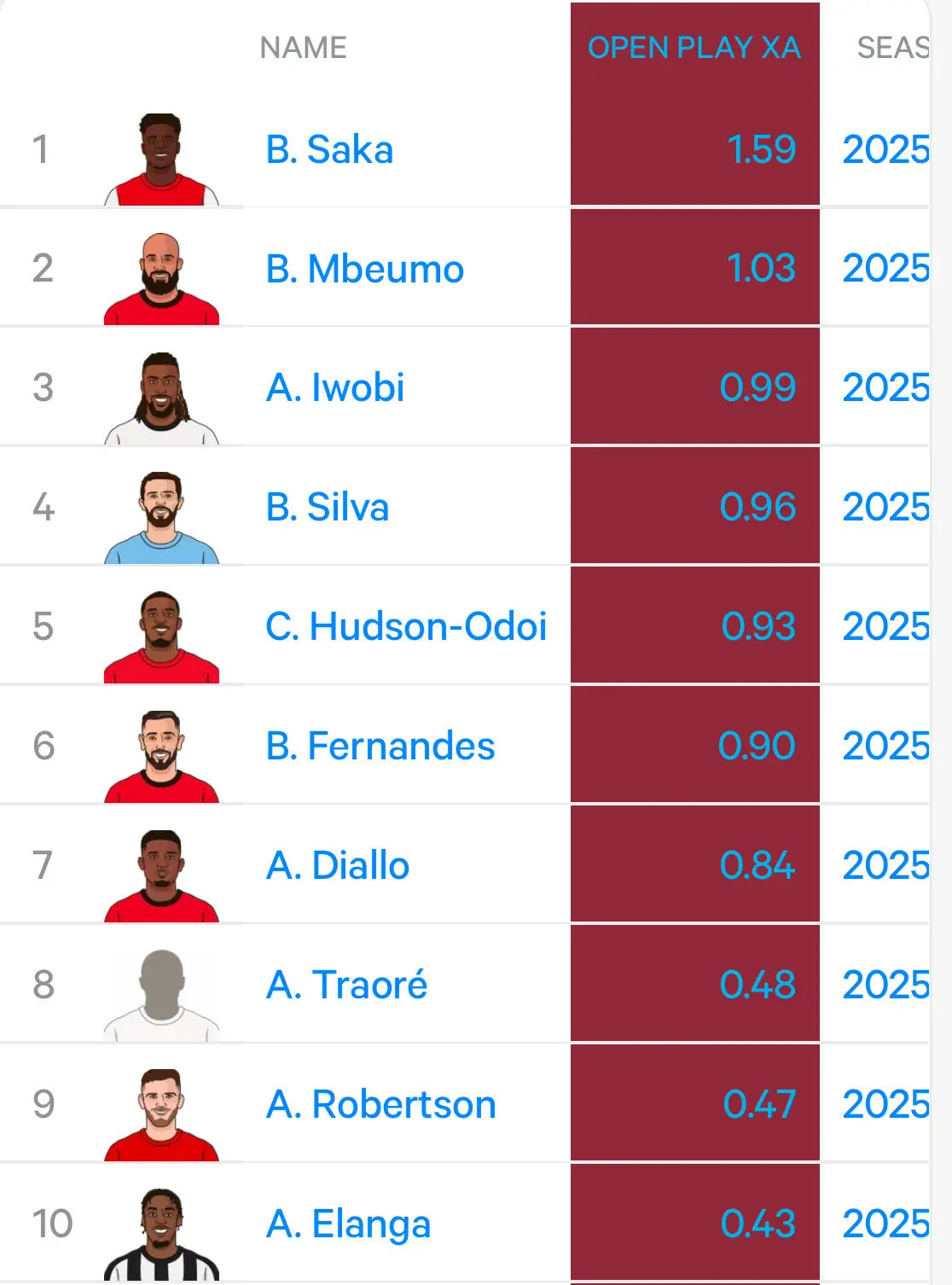 萨卡以 1.59 的数值遥遥领先,说明他在开放比赛中为球队创造的预期进球机会远高于其他球员,是俱乐部的核心进攻组织者。