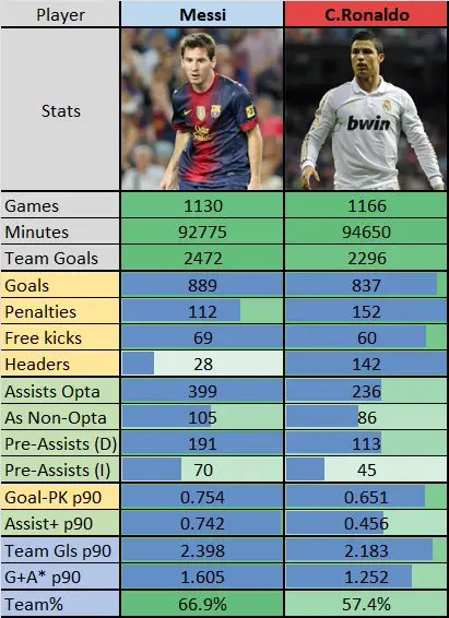 表格从多个维度对比了梅西和C罗的表现,包括出场次数、进球、助攻、效率指标等。数据来源可能基于Opta等权威统计机构,但部分指标(如“非Opta助攻”)可能来自其他统计标准。