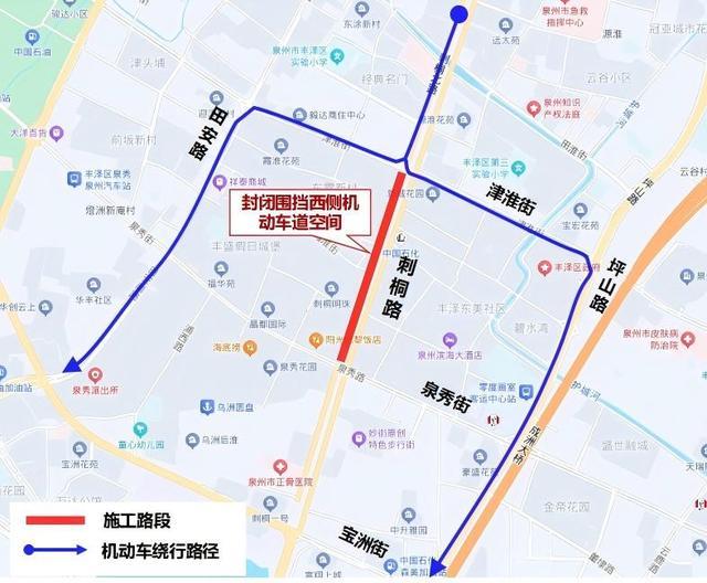 记者注意到,18日,泉州市公安局交通警察支队丰泽大队联合泉州市政排水有限公司发布了“关于刺桐路(津淮街—泉秀街)西侧机动车道施工期间实施交通限制的通告”。通告称,泉州市政排水有限公司拟实施管线修复及道路应急抢修工作,为确保工程顺利实施,保障周边道路交通安全、有序、畅通,根据《中华人民共和国道路交通安全法》第三十九条规定,施工期间刺桐路(津淮街—泉秀街)采取由南往北单向通行的交通组织。具体限制措施为:2025年10月19日至2025年10月24日,对刺桐路(津淮街—泉秀街)西侧机动车道封闭施工,禁止一切机动车通行,非机动车、行人不受影响,东侧路段由南往北实施单向通行。
