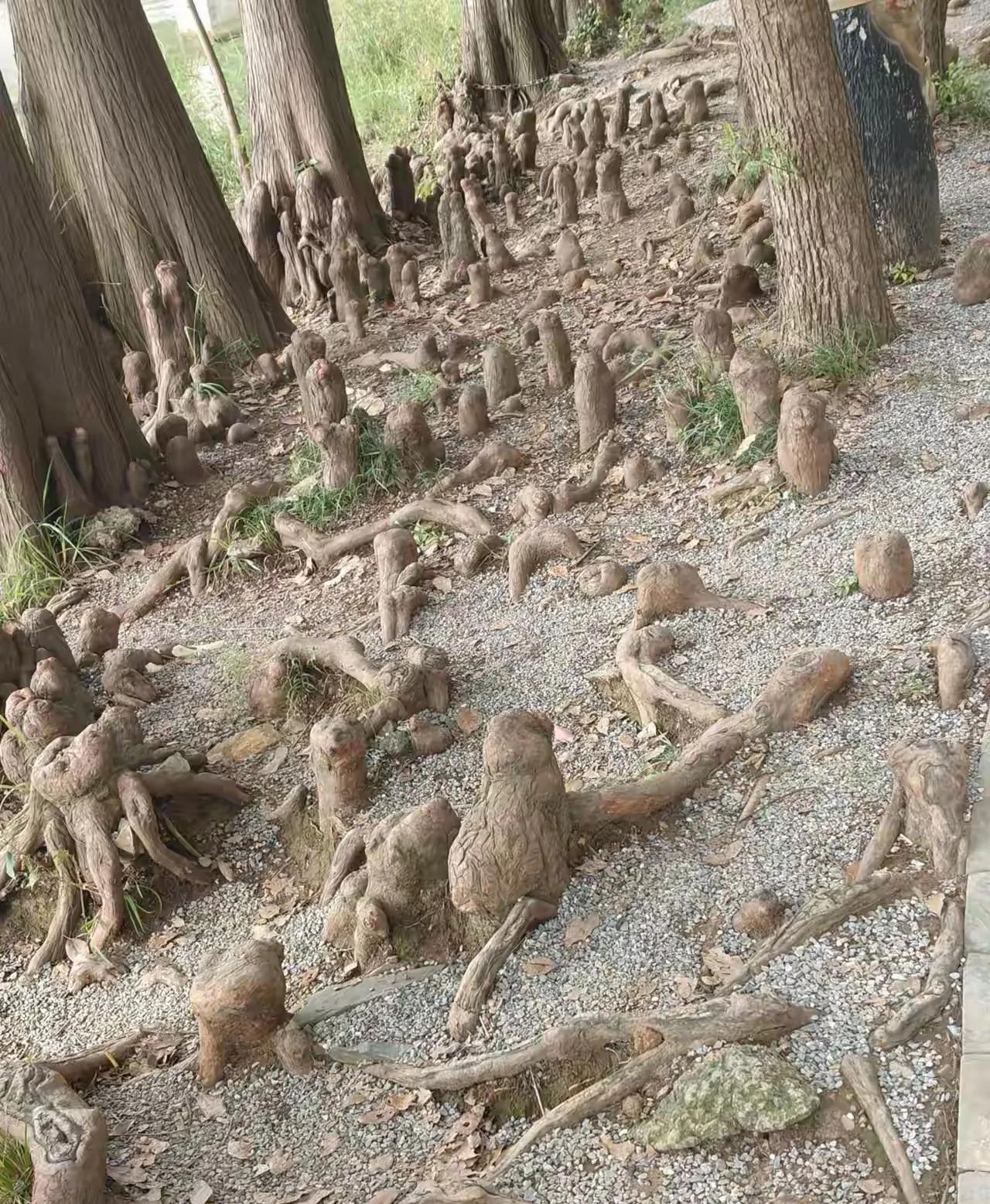前天下午,与几个朋友一起去某湿地公园玩,路过骑行道两边的一片红杉林时,发现树林的下面有一大片密密麻麻的东西。远远望去似一只只大小不一,形态各异的小动物,有的像兔子,有的像老鼠,也有的像狗。有的仰着头看着天空,有的趴在地上,有的像在睡觉,也有的似东张西望在找着什么东西。这种大自然的美景,让人仿佛来到了一个奇妙的动物世界。 可走近后细细一看,这些满地都是小动物形状一样的东西,原来是这些树冒出地面的根。 对于这些东西,我们几个还是第一次见,开始时感觉很新鲜,可多看了又感觉很害怕,头皮都会发麻,好似看到了不该看到的东西一样。 我们上网查了很多“专家”的诊断,结果也是各有各的说法。有的说:这是树木生病后,根部长出来的树瘤。也有说:这是树木营养过剩的原因。还有的说:这与树木生长的环境有关。反正是说法太多了。 最后,我把照片发给一个园林界的老师傅,他告我们说:“水杉这种树,大多都生长在湿地上或河边等地方居多,其根系容易缺氧,所以会通过细胞分裂冒出地面,形成各种大小不一,形态各异的气根来帮助树木呼吸,于是就有了这些有趣的树根疙瘩,这是很多水杉树在自然生长中的必然”。 网上的朋友们,这种现象你们见到过没有。 还有,你们认为园林老师傅的解释有没有道理啊。