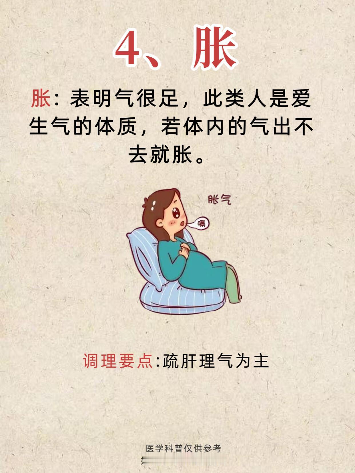 ✅胀: 表明气很足,此类人是爱生气的体质,若体内的气出不去就胀。