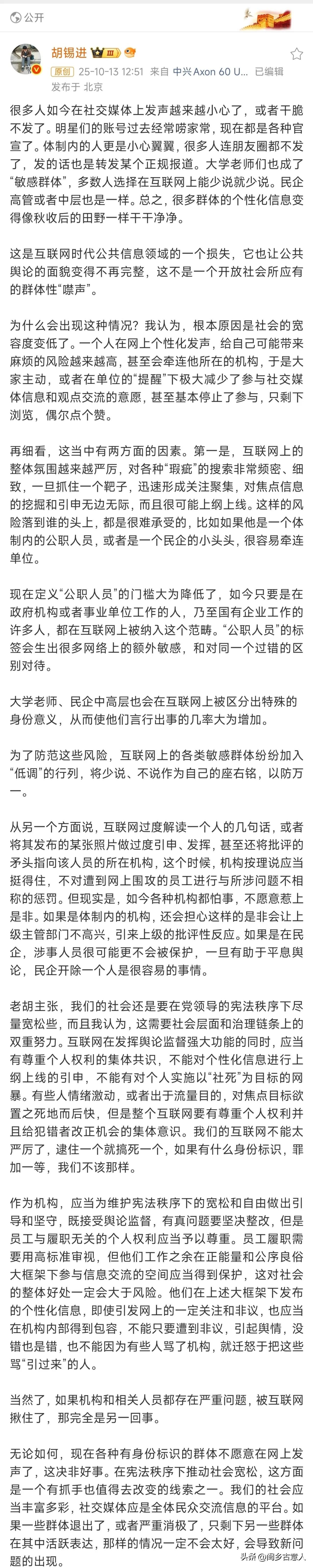 老胡的这篇文写到很多人的心坎上,写得很不错,社会的宽容度变低变得严厉,导致大家不敢发言了 现今互联网上对各种“瑕疵”搜索非常细致,抓住一个靶子迅速形成关注聚集,对焦点信息的挖掘和引申无边无际、上纲上线 以前的社会网络确实是比现在宽松多了!作为一个有着20多年的老网虫,是深有体会,从最早的聊天室到后来的各大坛论以及现在的各大平台。 从前能在网上接触各行各业的人看到他们发布的观点,像是有在国企、单位上班的一些基层人士,也有些公职人员,大学讲师等等。 比如20多年前"孙志刚事件"的讨论中,某政法论坛同时出现了民警、法学教授和打工者的声音,他们用"楼主"、"沙发"这样的中性称谓相互称呼,讨论的焦点始终聚集在收容遣送制度的合理性上。 当时的网络环境下,任何职业的人都可以在网上畅所欲言,发表自己的观点,哪怕是有人的观点不对,网友们也只是指出错误不合理的地方,再阐述一下自己的观点。 而不是会抓住某个人的身份,他说了什么做事,认为以他的身份,不应该说那样的话,更不会让个人的网上行为,让用人单位出面澄清或者要求将其开除。 然而,现在就不同了,别说公职人员,就连明星、大学老师,私企中高层等有身份的人,他们都不敢参与某事件讨论中,随便在网上发表自己的看法,省得有人会用放大镜去找茬,给他们带去麻烦。