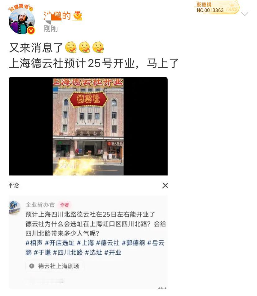 【上海德云社预计25号开业,郭德纲商业布局再次扩张,你怎么看?】 近日,有网友传
