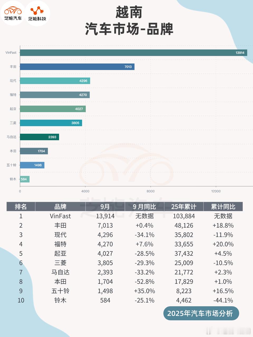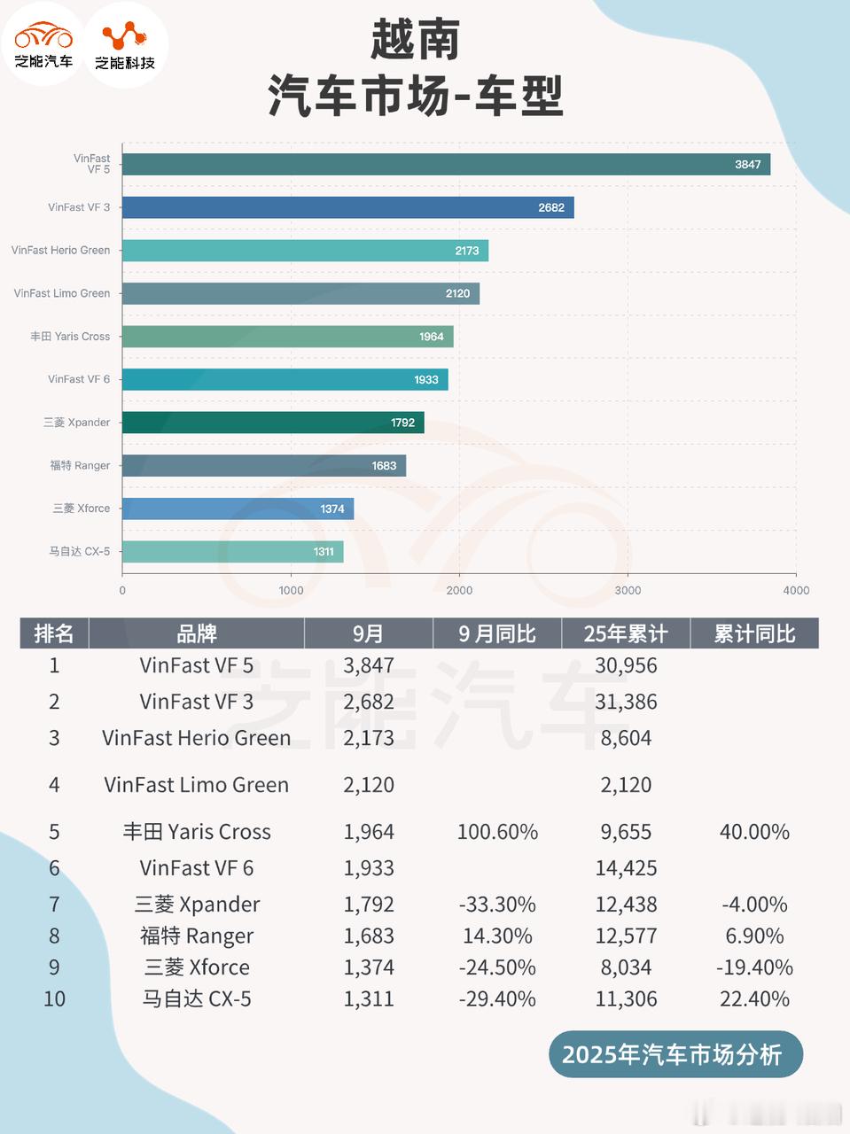 2025年9月,越南汽车销量同比下滑,市场阶段性回调,但累计销量仍保持增长。本土品牌VinFast强势崛起,以近三成市场份额稳居第一,多款电动车型包揽销量榜前列,主导市场转型。