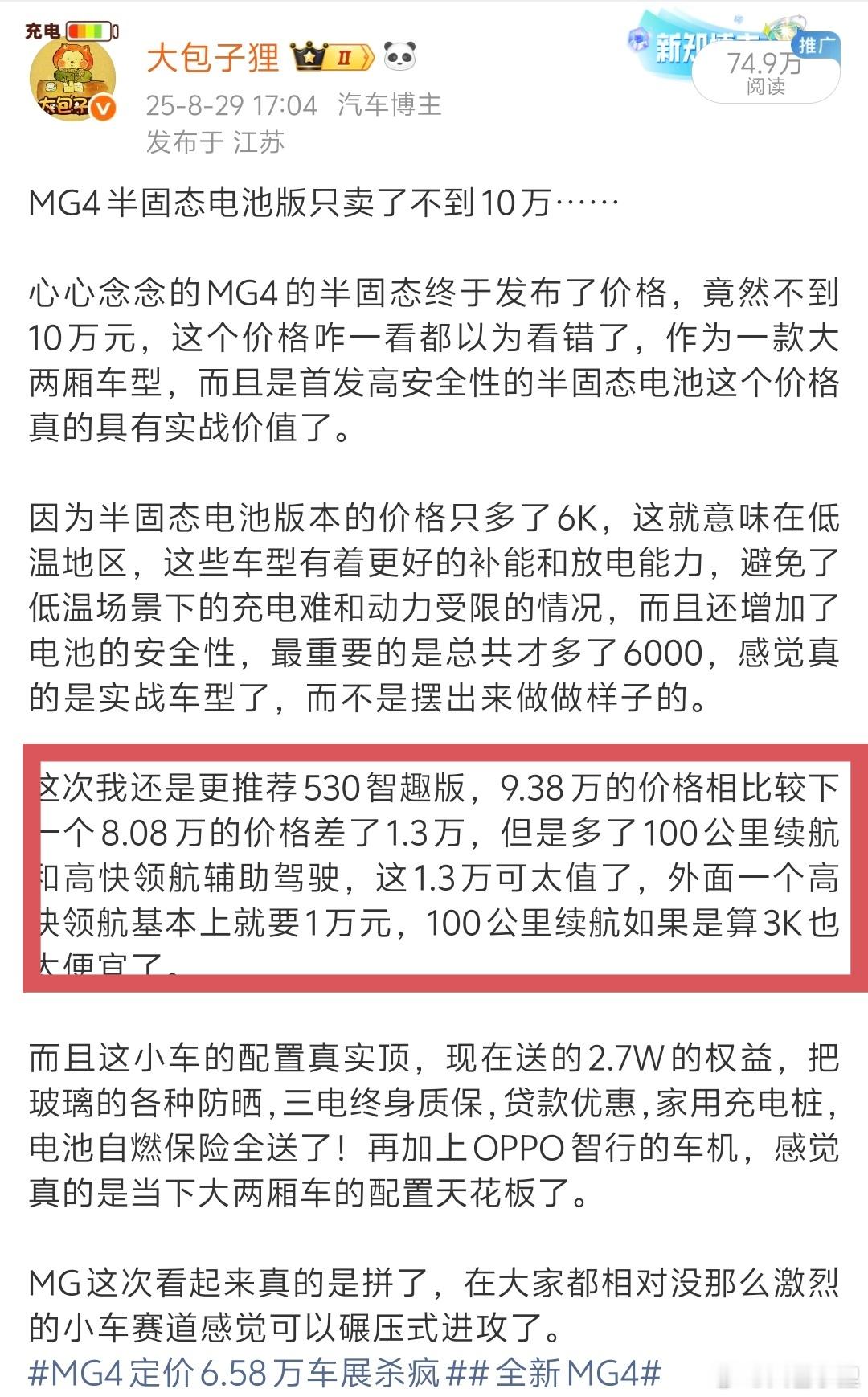 因为全新MG4的销量实在太好了,MG给智趣版替换了宁德时代的电池,虽然成本更高,但是好歹能赶上10月份的交付了。