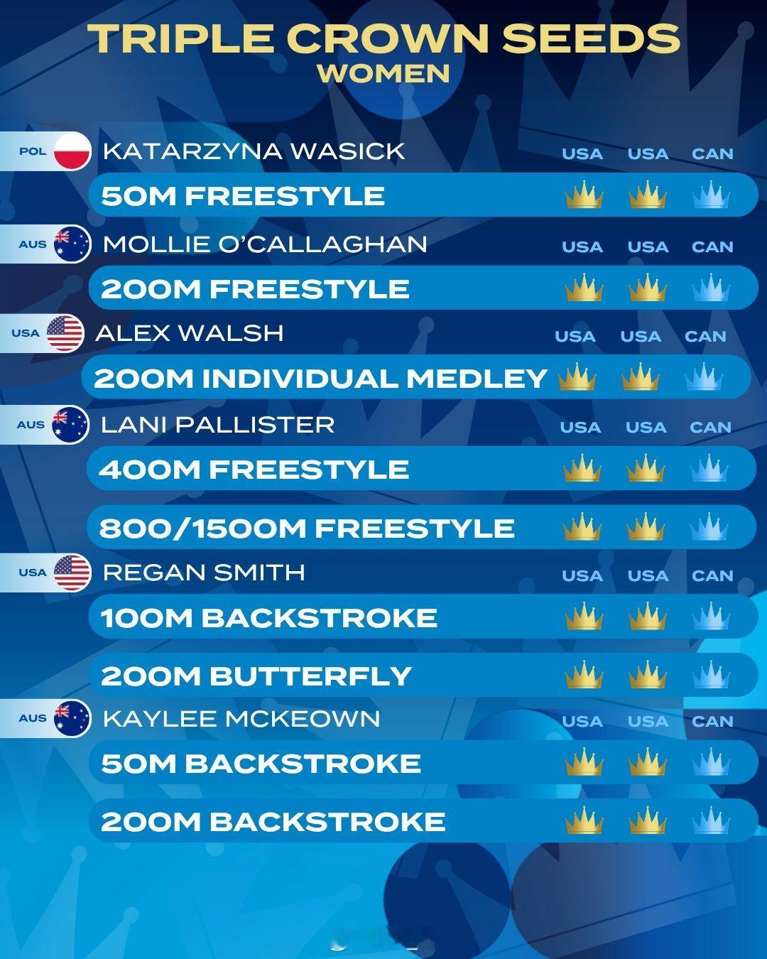 游泳世界杯前两站已经取得单项两连胜的选手们。如果在最后一站多伦多站完成三连冠将获得额外10000刀奖金奖励和皇冠👑一顶。