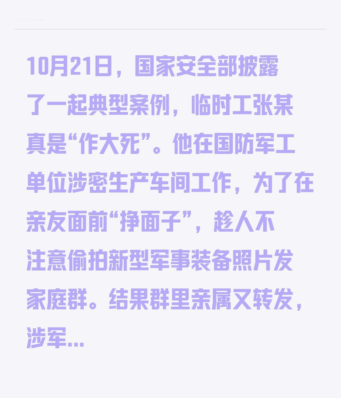 10月21日,国家安全部披露了一起典型案例,临时工张某真是“作大死”。他在国防军工单位涉密生产车间工作,为了在亲友面前“挣面子”,趁人不注意偷拍新型军事装备照片发家庭群。结果群里亲属又转发,涉军涉密信息迅速在网上扩散,造成严重失泄密危害。 最终,张某因故意泄露国家秘密罪获刑5年。这真是得不偿失,为了所谓的面子把自己送进了监狱。保密无小事,每个人都得有保密意识,别像张某一样,一失足成千古恨。涉密单位也得加强管理,守护好国家安全与利益。