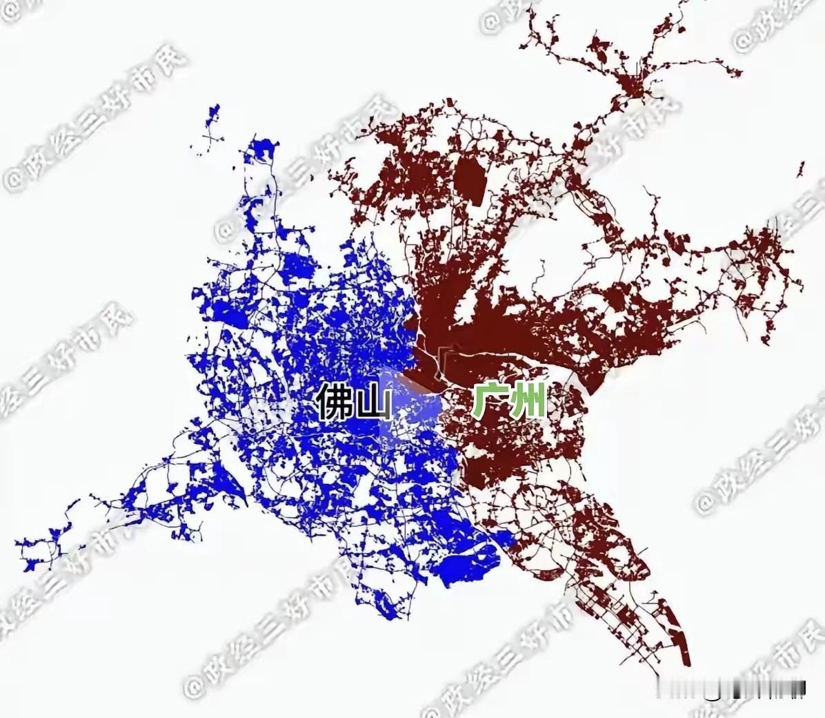 原本以为西安和咸阳已经离得很近了,并且有地铁相通。可没想到,广州和佛山竟已经同城化了,城区部分紧紧相连,你中有我,我中有你,就连两边市民可能都分不清自己是在广州还是在佛山,且地铁等公共交通已经互联互通,看着和一个城市没啥区别。 如果把它俩看成一个城市,会不会成为中国城区面积最大的城市?评论区说说。(图片来自网络)咸阳 佛山市 广佛地铁站 广佛城际线 佛山地图 佛山广州融合 咸阳西安
