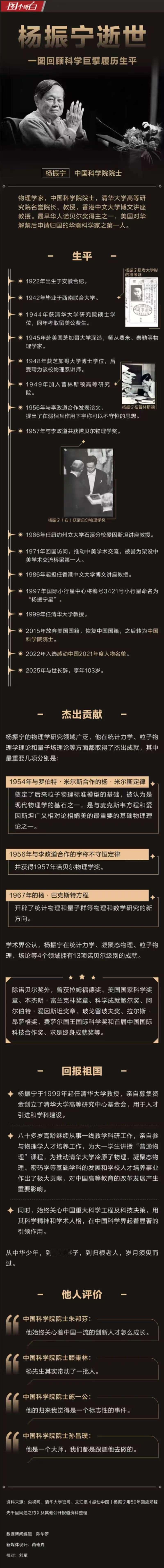 一图回顾杨振宁先生的一生~ 1922年出生于安徽合肥,1957年获得诺贝尔物理学奖,成为首位获此殊荣的华人科学家。他与米尔斯提出的杨-米尔斯规范场论,被誉为20世纪物理学最重要的成就之一。2003年前妻杜致礼去世,2004年与翁帆结婚,相伴21年。回国20多年来在清华大学任教,培养无数人才,为中国科学事业做出卓越贡献。2025年10月18日在北京逝世,享年103岁,一生传奇落幕。