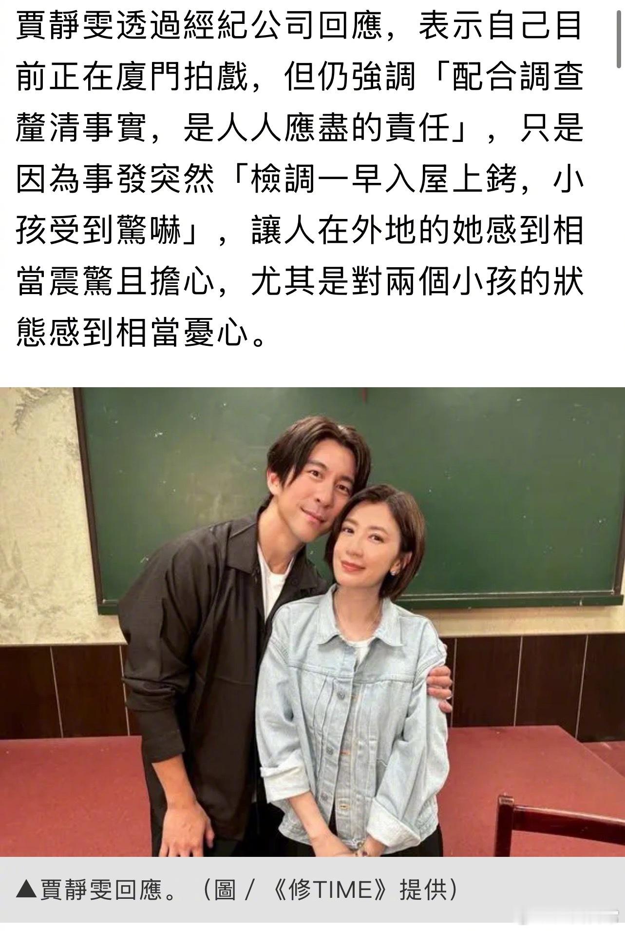 对于今早修杰楷被带走调查,贾静雯通过经纪公司回应自己正在厦门拍戏“检调一早进入家中给修杰楷上铐,小孩受到惊吓”,贾静雯很震惊也很担心孩子的情况