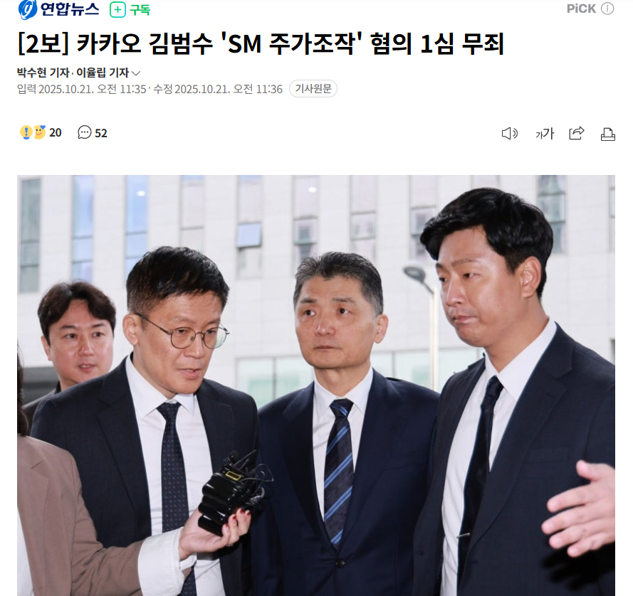 因涉嫌操纵SM娱乐股价而被起诉的Kakao创始人金范洙经营革新委员长在一审中被判无罪。