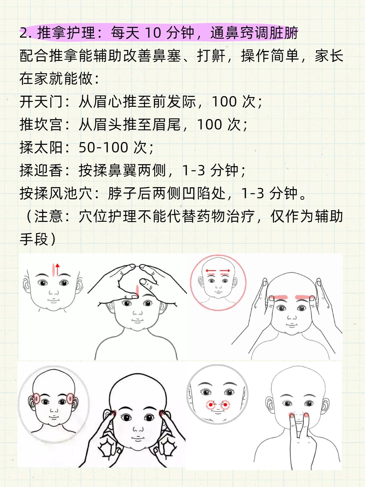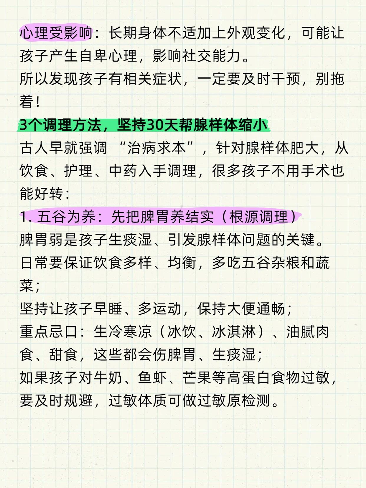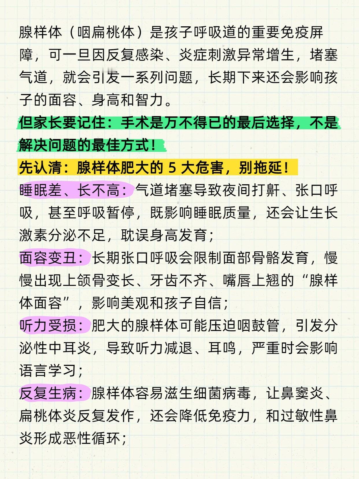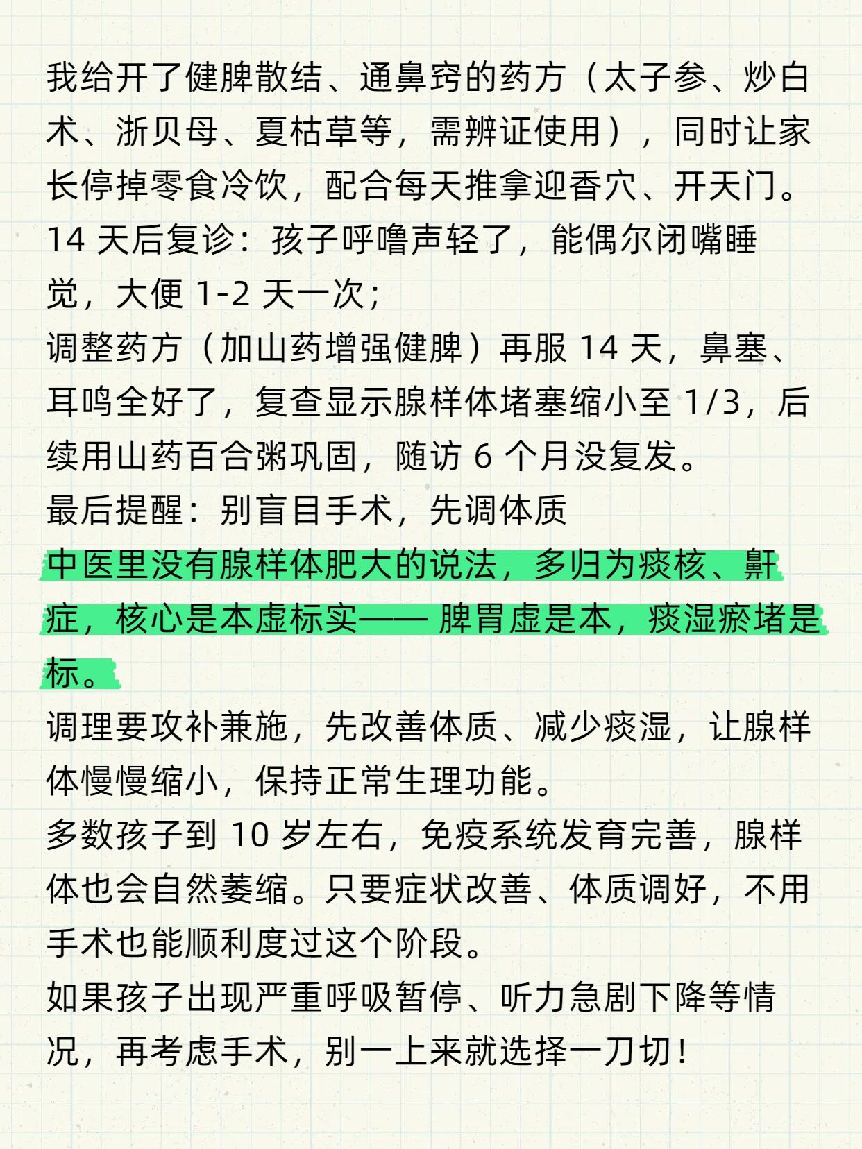 孩子腺样体肥大,手术是最后的方法,不是最好的方法! 腺样体(咽扁桃体)是孩子呼吸道的重要免疫屏障,可一旦因反复感染、炎症刺激异常增生,堵塞气道,就会引发一系列问题,长期下来还会影响孩子的面容、身高和智力。 但家长要记住:手术是万不得已的最后选择,不是解决问题的最佳方式! 先认清:腺样体肥大的 5 大危害,别拖延! 睡眠差、长不高:气道堵塞导致夜间打鼾、张口呼吸,甚至呼吸暂停,既影响睡眠质量,还会让生长激素分泌不足,耽误身高发育; 面容变丑:长期张口呼吸会限制面部骨骼发育,慢慢出现上颌骨变长、牙齿不齐、嘴唇上翘的 “腺样体面容”,影响美观和孩子自信; 听力受损:肥大的腺样体可能压迫咽鼓管,引发分泌性中耳炎,导致听力减退、耳鸣,严重时会影响语言学习; 反复生病:腺样体容易滋生细菌病毒,让鼻窦炎、扁桃体炎反复发作,还会降低免疫力,和过敏性鼻炎形成恶性循环; 心理受影响:长期身体不适加上外观变化,可能让孩子产生自卑心理,影响社交能力。 所以发现孩子有相关症状,一定要及时干预,别拖着!3个调理方法,坚持30天帮腺样体缩小 古人早就强调 “治病求本”,针对腺样体肥大,从饮食、护理、中药入手调理,很多孩子不用手术也能好转: 1. 五谷为养:先把脾胃养结实(根源调理) 脾胃弱是孩子生痰湿、引发腺样体问题的关键。日常要保证饮食多样、均衡,多吃五谷杂粮和蔬菜;坚持让孩子早睡、多运动,保持大便通畅; 重点忌口:生冷寒凉(冰饮、冰淇淋)、油腻肉食、甜食,这些都会伤脾胃、生痰湿; 如果孩子对牛奶、鱼虾、芒果等高蛋白食物过敏,要及时规避,过敏体质可做过敏原检测。 2. 推拿护理:每天10分钟,通鼻窍调脏腑 配合推拿能辅助改善鼻塞、打鼾,操作简单,家长在家就能做: 开天门:从眉心推至前发际,100次; 推坎宫:从眉头推至眉尾,100次; 揉太阳:50-100次; 揉迎香:按揉鼻翼两侧,1-3分钟; 按揉风池穴:脖子后两侧凹陷处,1-3分钟。 (注意:穴位护理不能代替药物治疗,仅作为辅助手段) 3. 中药调理:辨证施治,攻补兼施 如果前两种方法效果不佳,可尝试中药调理,核心是 “治根”: 若孩子爱吃肉、大便干、易上火,多是 “积食内热”,需健脾清热; 若孩子鼻塞流清涕、手脚凉、易感冒,多是 “脾肺虚寒”,需驱寒健脾、软坚散结。 中医讲究 “一人一方”,会根据孩子体质调整药方,既消结节,又改善病因,比单纯对症治疗更有效。