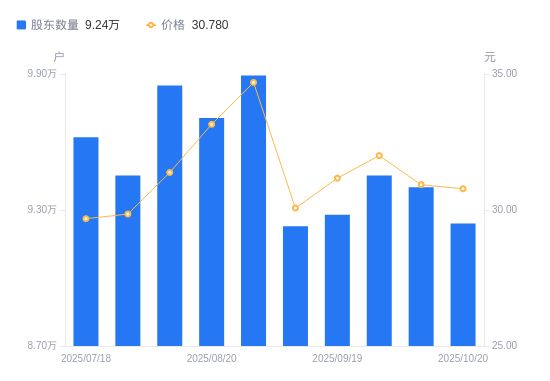 日期A股户数(户)流通A股户均持股数(股)户均持股市值(万元)2025-10-20924087857.0124.182025-10-10940037723.7023.892025-09-30945227681.2924.582025-09-19927887824.8324.392025-09-10922887867.2323.662025-08-29989357338.6625.462025-08-20970637480.2024.802025-08-08984967371.3723.132025-07-31945207681.4522.932025-07-18962127546.3622.40