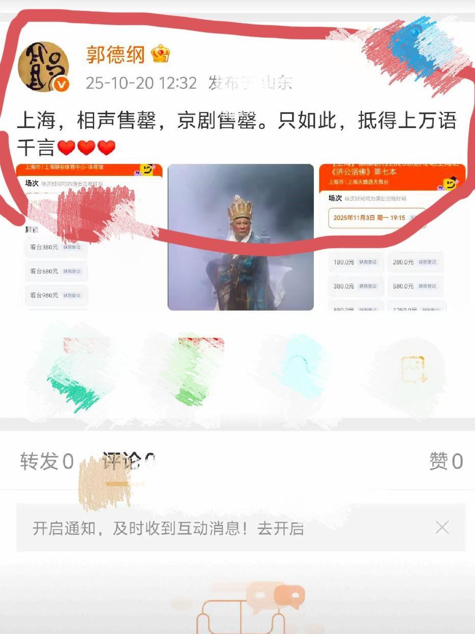 郭德纲最新回应杨议来了!昨天郭德纲发文炫耀:上海我的相声售罄了,我的京剧也售罄了