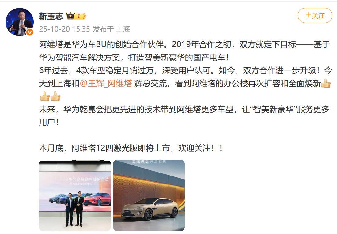 我天!刚刷到华为智能汽车解决方案BU CEO靳玉志去阿维塔新办公楼了!这事儿比我刷到明星还让人惊讶,要知道这CEO可不是随便串门的,这波绝对是有大动作要官宣啊! 靳玉志自己在微博里也说,阿维塔是华为车BU的创始合作伙伴,2019年刚合作就定下目标,要基于华为智能汽车解决方案造智美新豪华的国产电车。现在6年过去,4款车稳稳做到月销过万,用户都认账,这已经不是普通合作能做到的,这完全是“长期主义”的活例子! 现在很多合作都是“赚快钱”,能像他俩这样从起步阶段就绑在一起,还越做越深的真不多。不光是给技术,连5G智能工厂、鸿蒙生态都打通了,形成了完整的出行生态。而且华为乾崑现在厉害得很,累计辅助驾驶里程超51.3亿公里,合作车型都有28款了,却还这么看重跟阿维塔的合作,这就是 “强强联合” 的典范! 靳玉志还说未来会把更先进的技术带给阿维塔,这不仅是他俩的事儿,更是给整个行业打样。中国智能汽车要想全球领先,就得靠这种互相信任、长期深耕的合作!