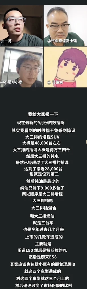 纯电大三排SUV9月销量达28000台,首次超越插混大三排的23000台