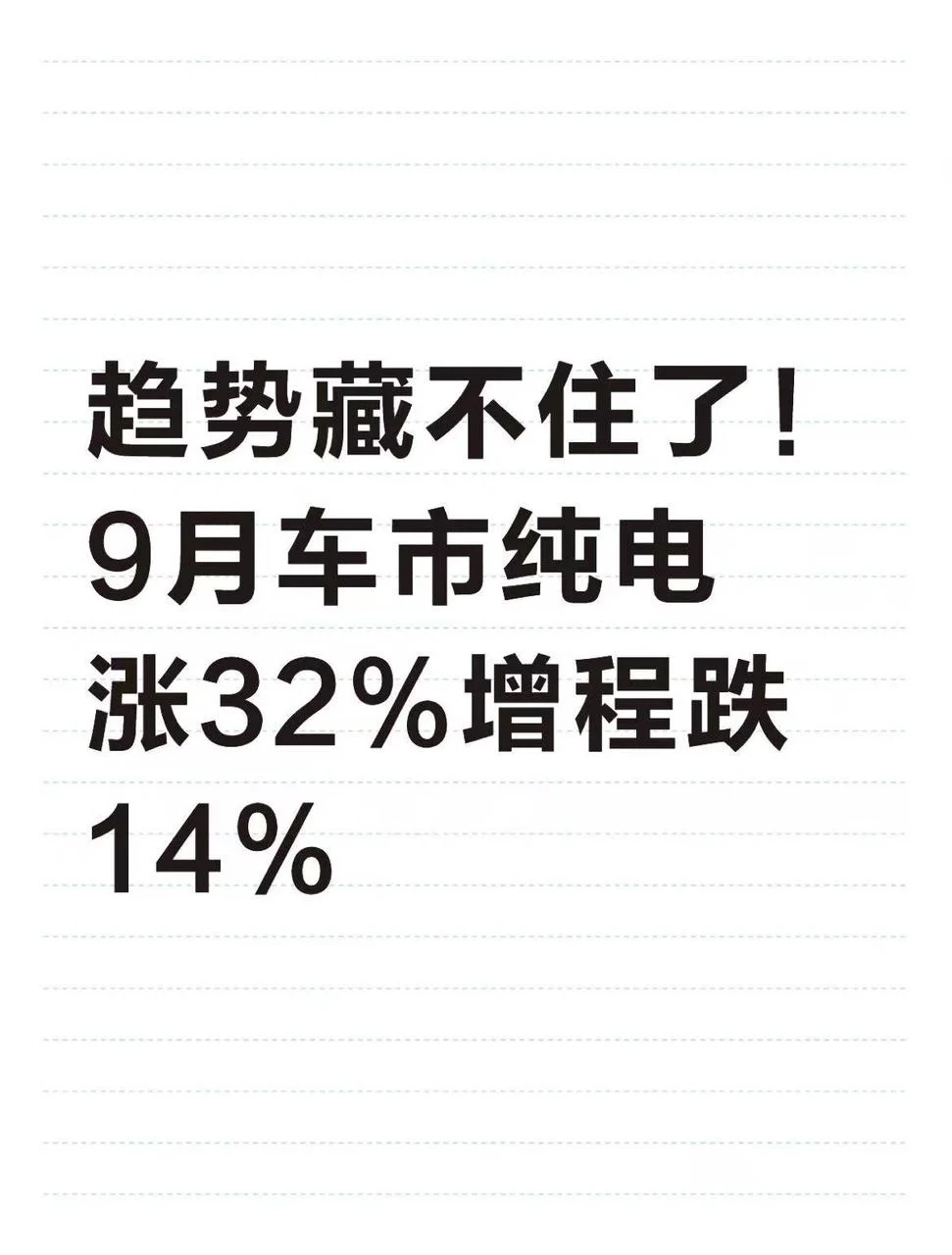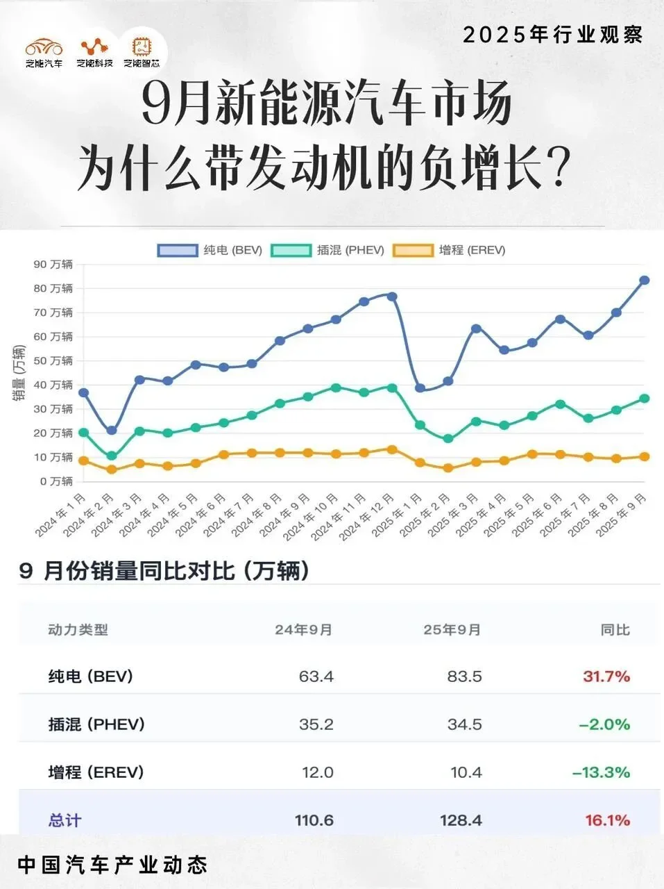 翻到9月新能源销量很震惊:纯电卖了83.5万,同比增长32%,增程才10.4万负增长14%!