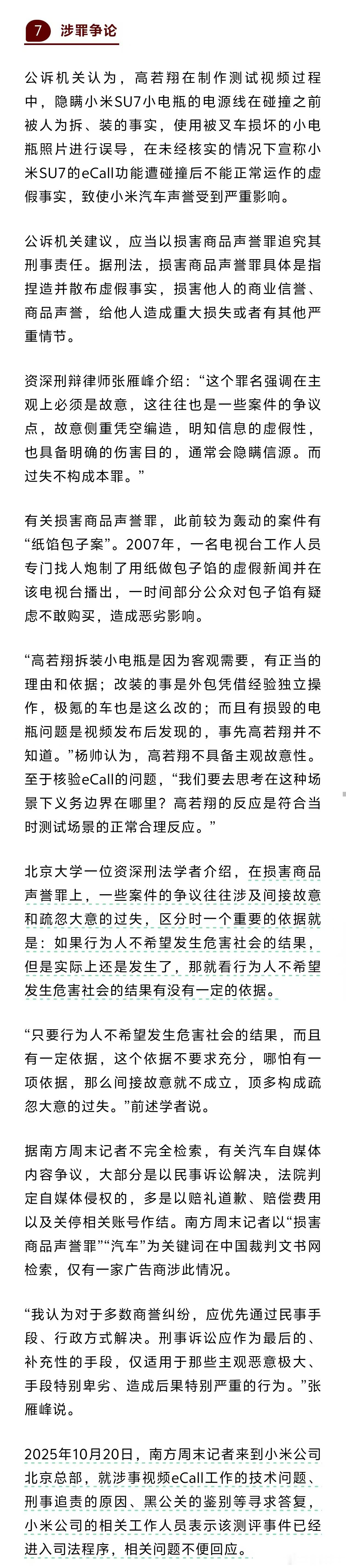 「公诉机关认为,高若翔在制作测试视频过程中,隐瞒小米SU7小电瓶的电源线在碰撞之前被人为拆、装的事实,使用被叉车损坏的小电瓶照片进行误导,在未经核实的情况下宣称小米SU7的eCall功能遭碰撞后不能正常运作的虚假事实,致使小米汽车声誉受到严重影响。」