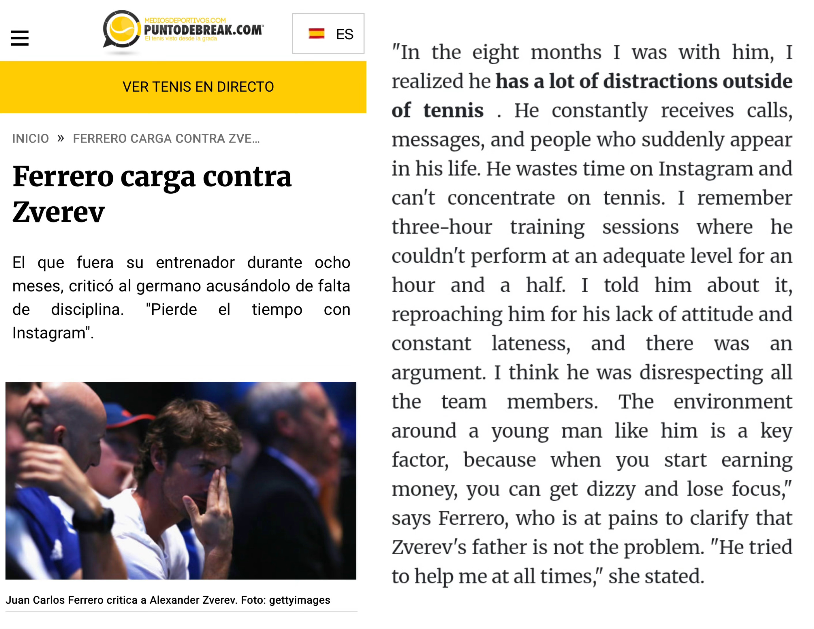 这边话音刚落,那边兹维列夫的前教练费雷罗又发话了:“我们合作的八个月里,我发现他有很多让他分心的事情,老有电话短信找他,老有人突然出现在他的生活里。他在ins上浪费时间,无法在网球上集中精力。三小时的训练,他只能保持一个半小时的水准。我找他聊过,指出他的态度问题还有老是迟到,我们有过争执。他对团队成员缺乏尊重,周围环境对他这样的年轻球员很关键,因为一旦当他开始赚钱了以后,就容易迷失并失去专注。”