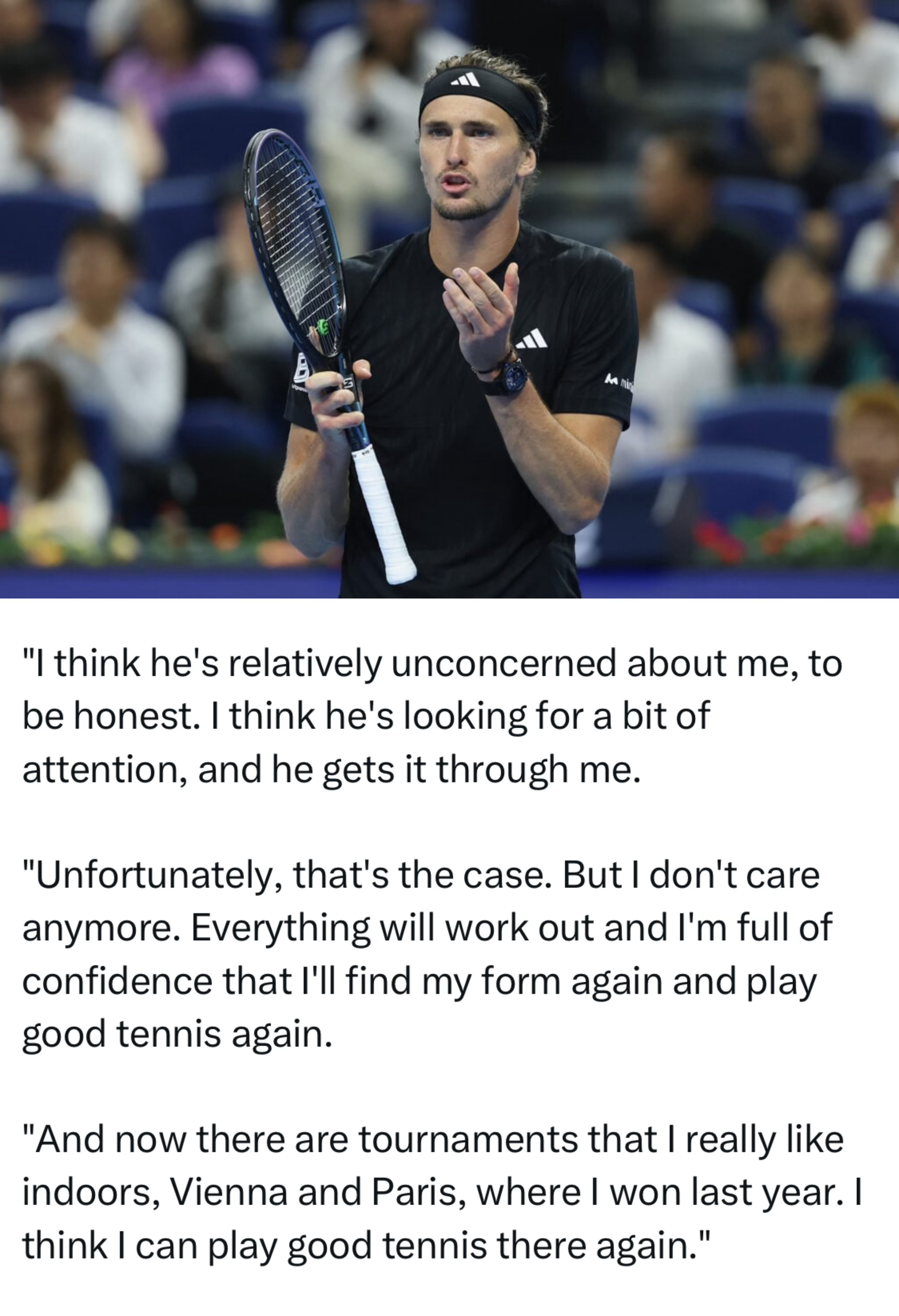 对此兹维列夫回应:“我觉得他并不关心我,他只是想通过我寻求一点关注度。我有信心能找到办法,重新打出状态。接下来都是我喜欢的室内赛事,维也纳站和去年我夺冠的巴黎大师赛,我觉得我能在那里有很好的表现。”