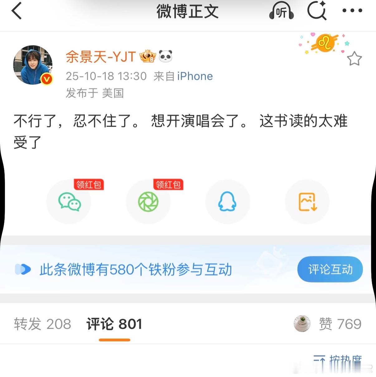 余景天:想开演唱会了。这书读的太难受了