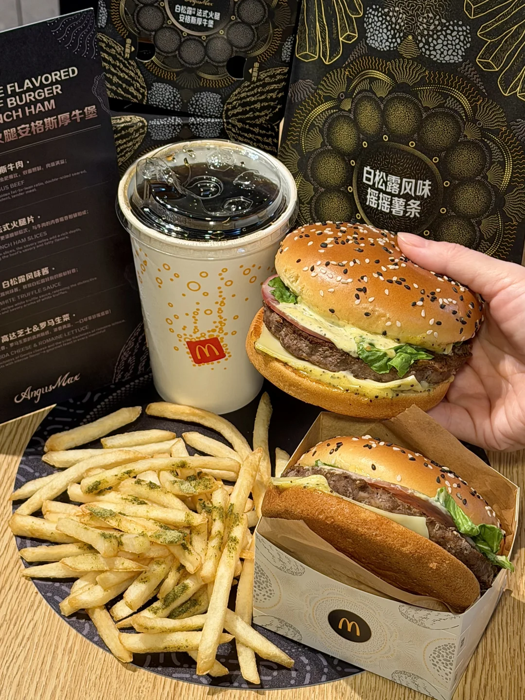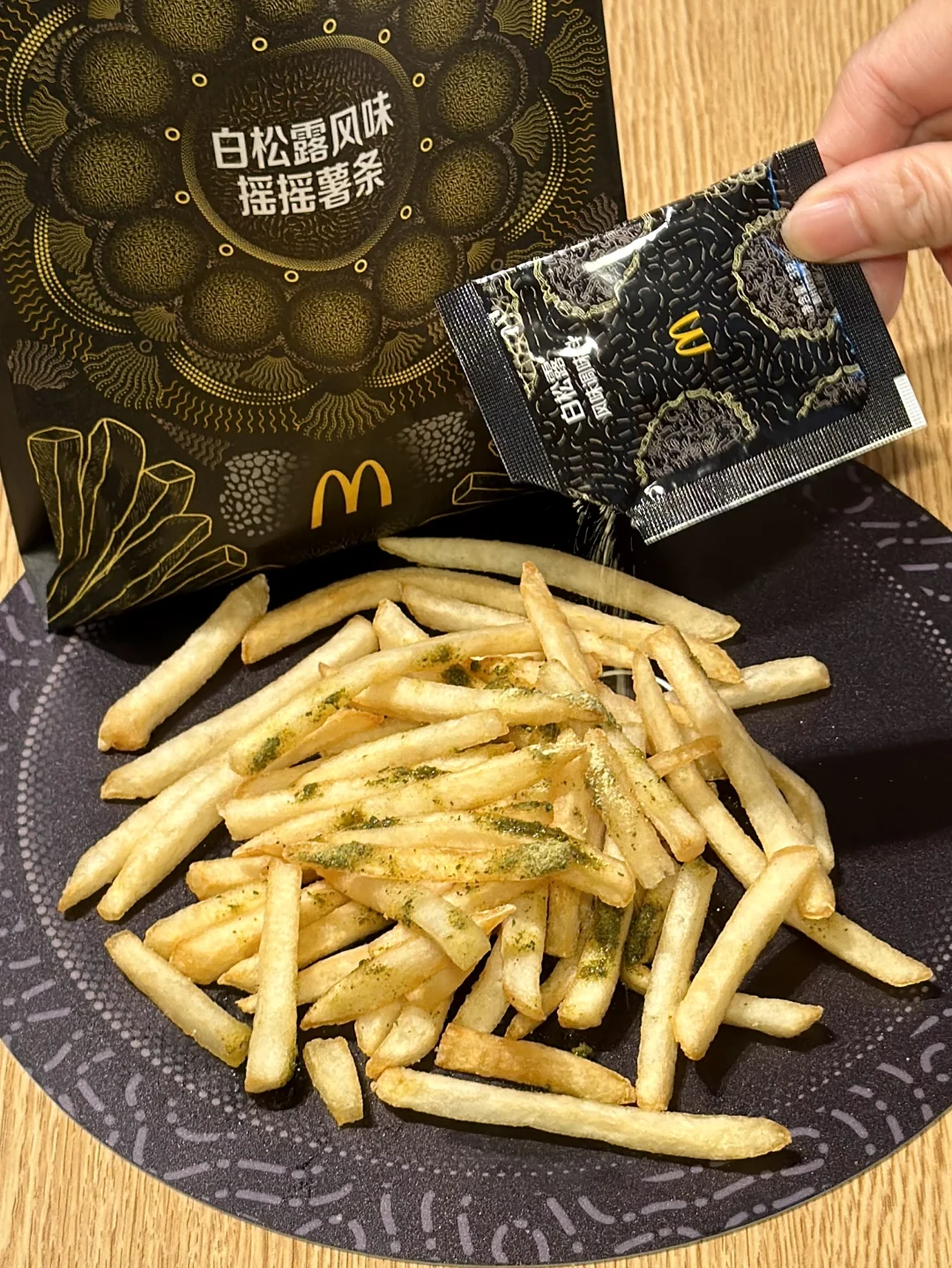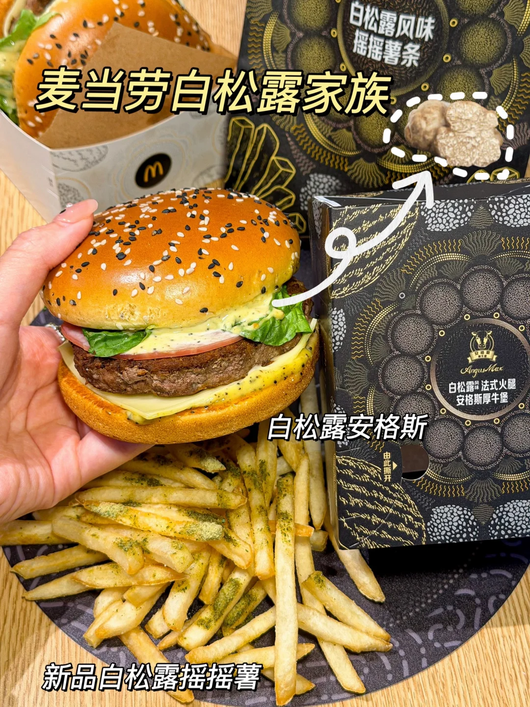 一口白松露汉堡一口白松露风味摇摇薯条🍟快乐子!整个口腔都被白松露味包裹~摇摇薯条趁热咸香酥脆好吃到嗦手指!!