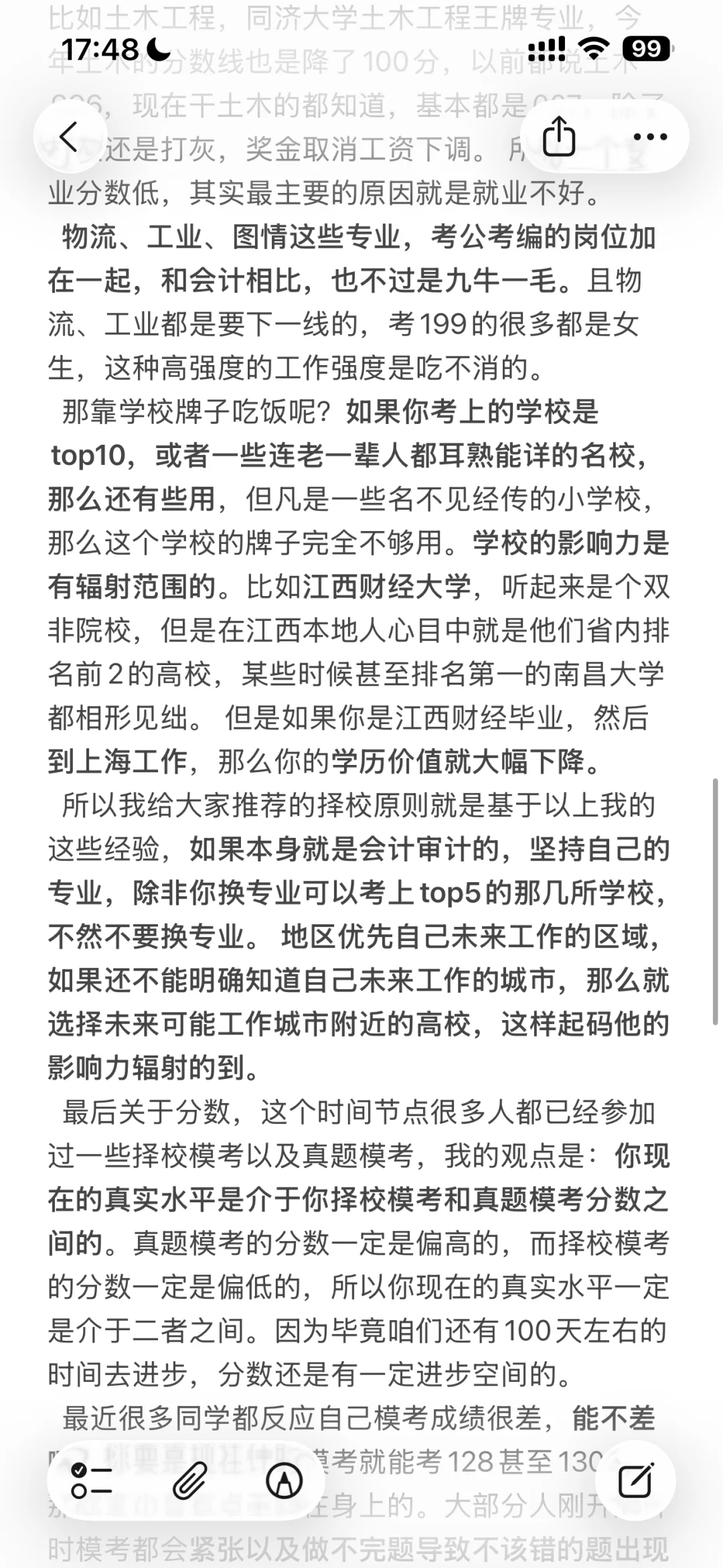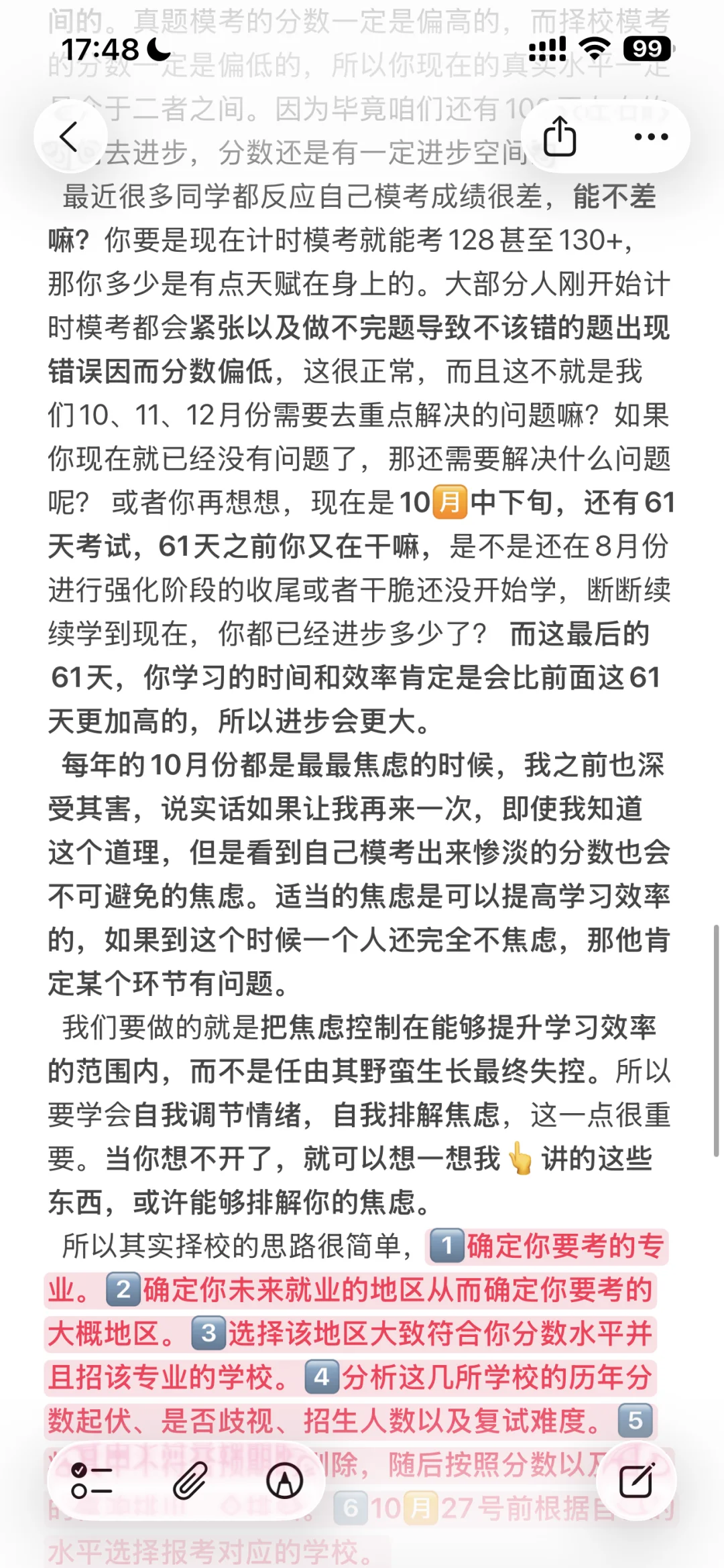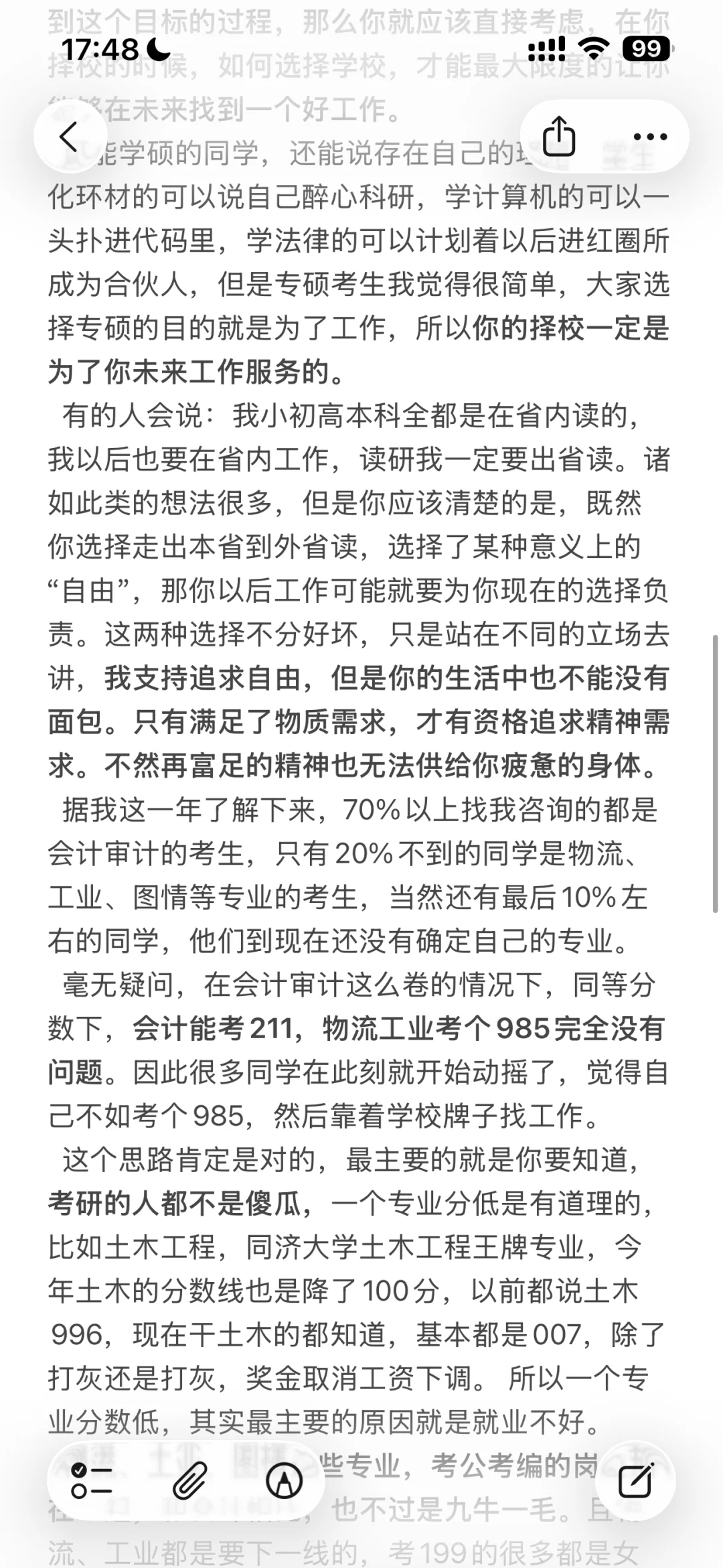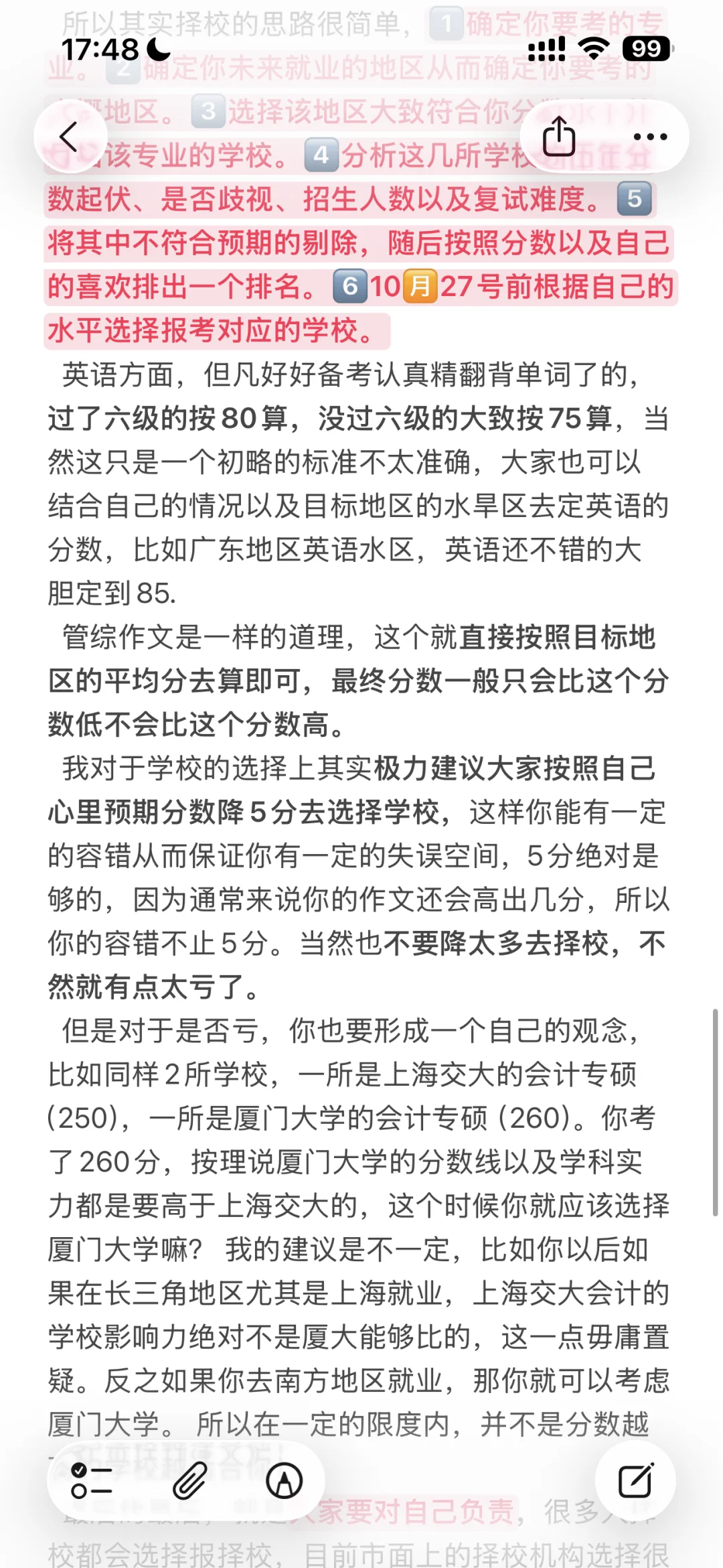 择校的思路很简单,1️⃣确定你要考的专业。2️⃣确定你未来就业的地区从而确定你要考的大概地区。3️⃣选择该地区大致符合你分数水平并且招该专业的学校。4️⃣分析这几所学校的历年分数起伏、是否歧视、招生人数以及复试难度。5️⃣将其中不符合预期的剔除,随后按照分数以及自己的喜欢排出一个排名。6️⃣10🈷️27号前根据自己的水平选择报考对应的学校。