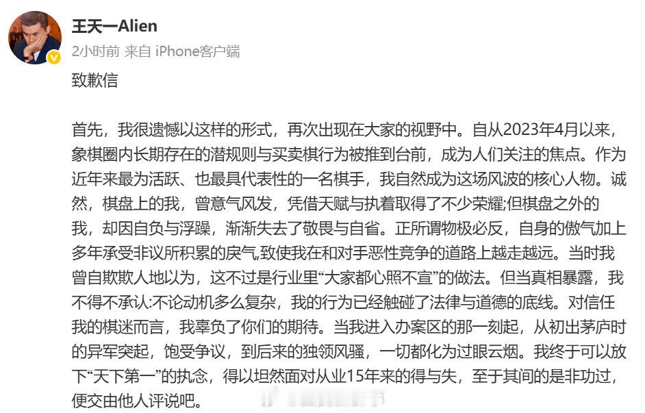 10月21日,发布致歉信:自从2023年4月以来,象棋圈内长期存在的潜规则与买卖棋行为被推到台前,成为人们关注的焦点。作为近年来最为活跃、也最具代表性的一名棋手,我自然成为这场风波的核心人物。诚然,棋盘上的我,曾意气风发,凭借天赋与执着取得了不少荣耀;但棋盘之外的我,却因自负与浮躁,渐渐失去了敬畏与自省。