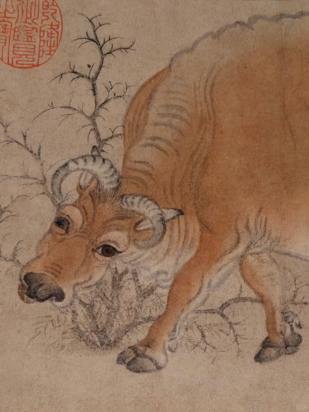 《五牛图》里,画家刻意去掉繁杂的背景,只留几笔荆棘草作为点缀,为的就是沉浸式欣赏五个“主角”。从右至左依次来看,棕色牛自在悠然,黑白杂花牛气宇轩昂,中间深褐色牛从容不迫,侧目的黄色牛活泼俏皮,最后出场的褚黄牛头系红络,表情高冷严肃。
