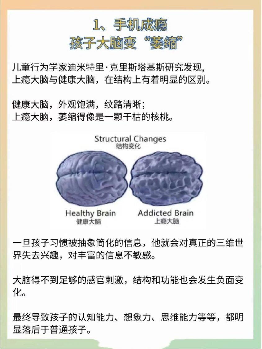 如今的青少年可谓手机不离身,每日耗费大量时间刷手机,认知能力明显下滑。2025年10月13日《美国医学会杂志》刊登的一项研究,追踪了6500多名9至13岁的青少年,结果发现,社交媒体使用时长的增加与认知能力的下降紧密相关。 刷手机时需要不断刷新页面、进行互动,相比单纯看电视,更消耗心智资源。长期频繁使用手机,会使人注意力难以集中、记忆力减退,还会影响判断力和思维能力。有些孩子刷手机成瘾,学习时根本无法静下心来。 为了孩子的大脑健康,必须限制他们玩手机的时间,例如每天不超过1 - 2小时,同时鼓励他们多参与阅读、运动等活动。 孩子手机上瘾 娃沉迷手机 孩子玩手机 儿童戒掉玩手机 手机对儿童危害 玩手机的意义 总看手机的危害
