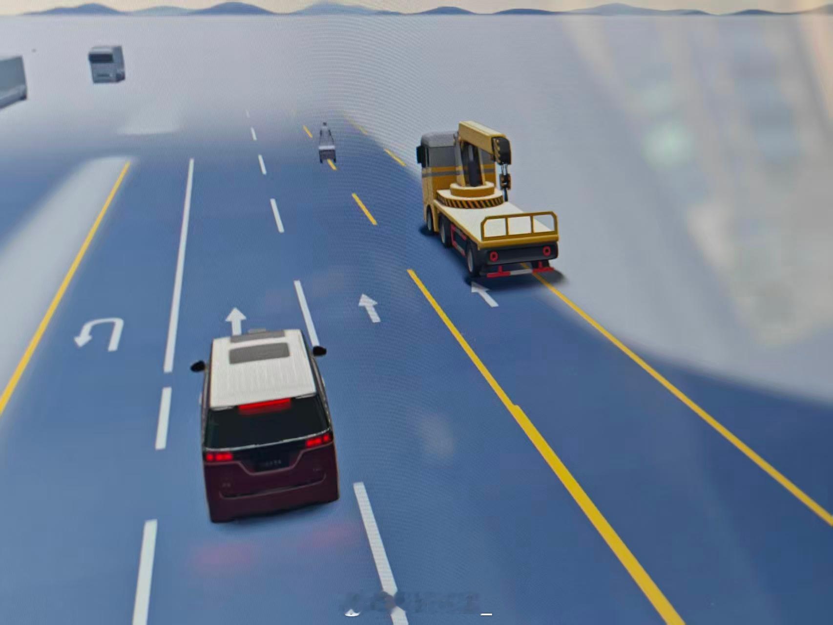 还有我们变道到右侧车道,遇到双闪的扫地车,系统也会直接重新变回来,这时候前面的扫地车还很远。