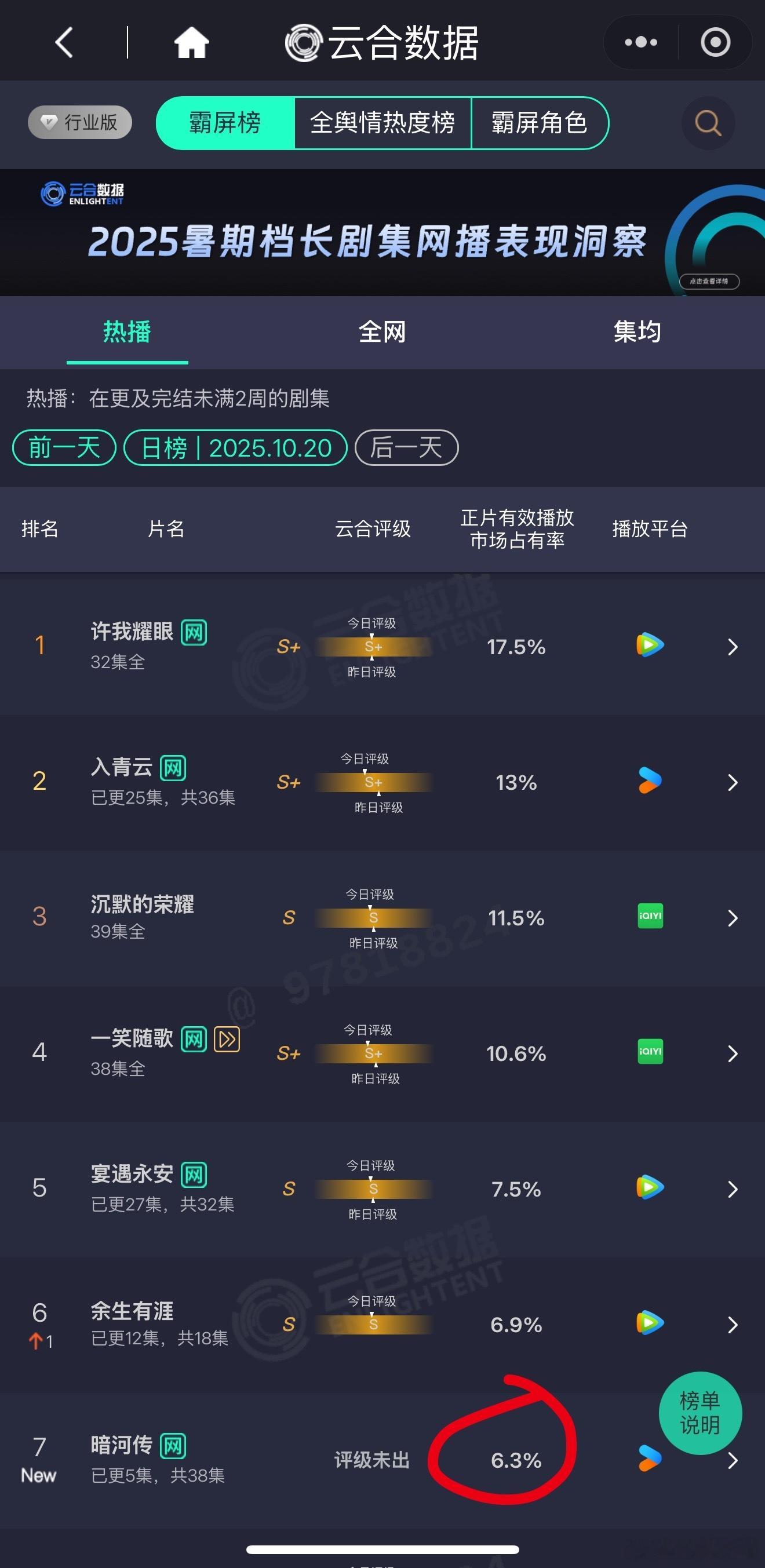 暗河传昨日云合,暗河传市占率6.3%开局,有一说一,这个表现对俊俊来说真的可以了[来抱抱]