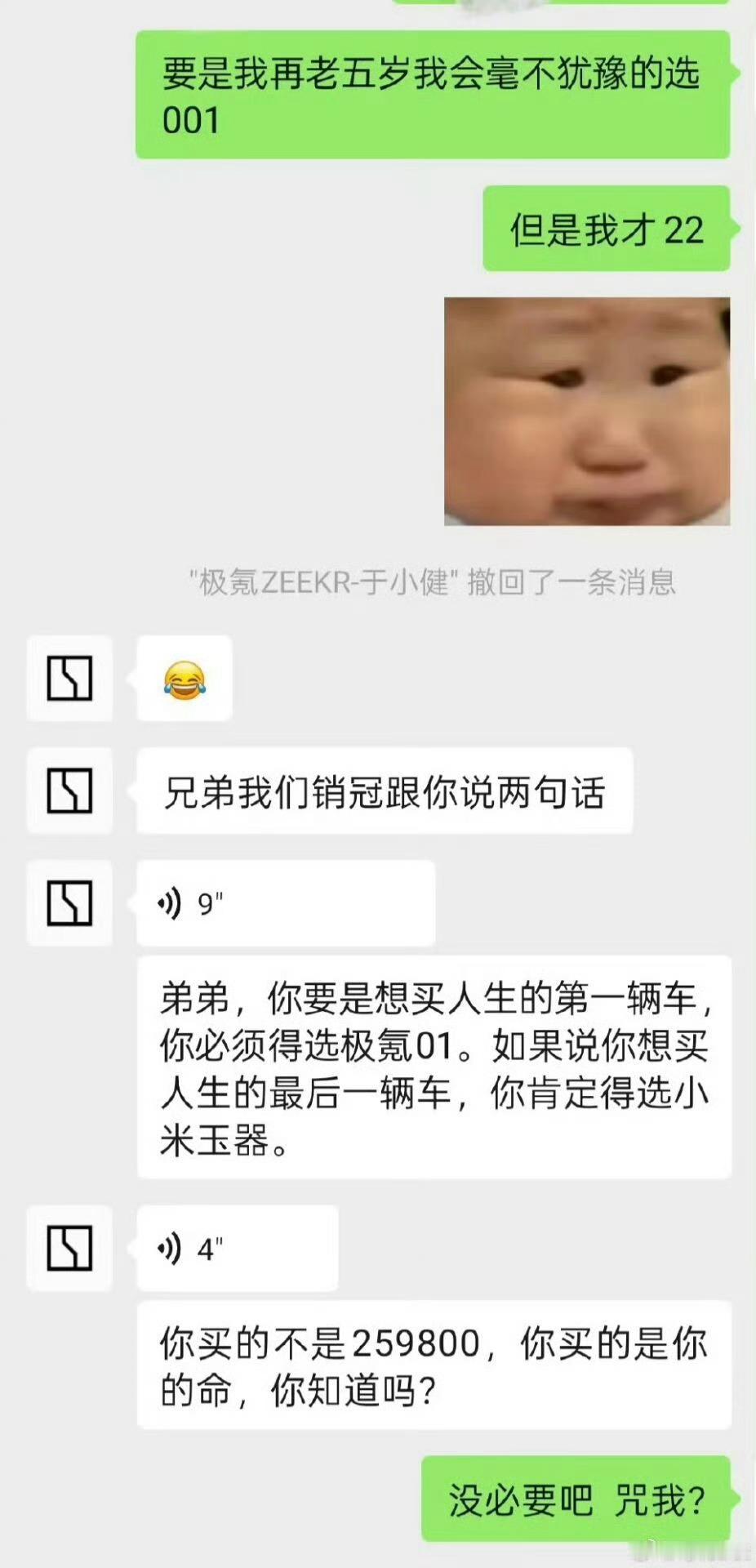 这销售发言太逆天了,还敢在微信上留痕,是真不想干了啊[哆啦A梦害怕]极氪销售称买小米YU7是买命