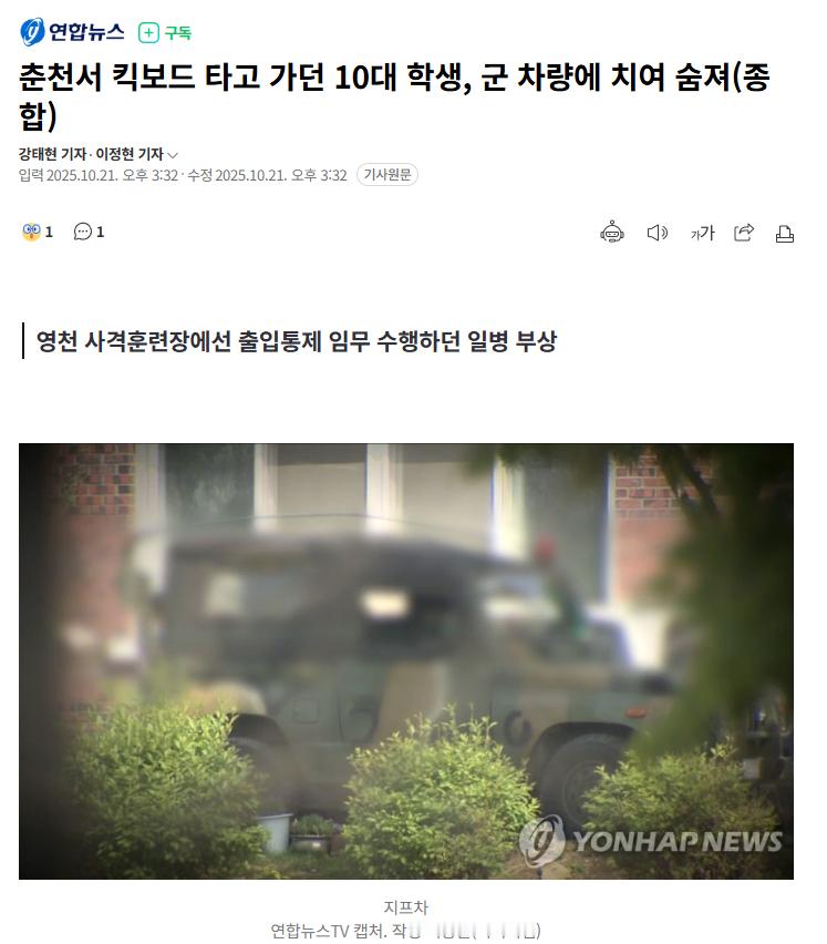 【韩国春川一骑电动滑板车的10多岁学生被军车撞倒身亡】海外新鲜事热点现场在江原
