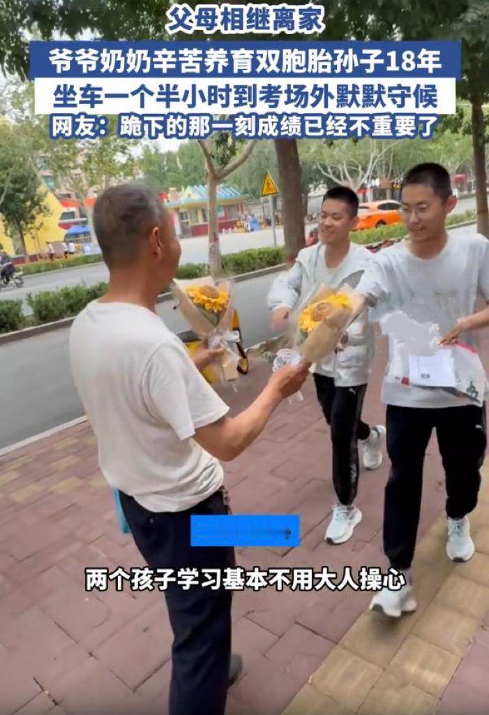 高温天爷爷陪考,双胞胎孙子磕头谢恩 骄阳似火,高考考场外,一位爷爷不顾高温,坚守在人群中为双胞胎孙子陪考。汗水湿透了他的衣衫,他却始终眼神坚定,为孙子们默默加油。考试结束,双胞胎孙子一出考场,便径直走向爷爷,双膝跪地,重重磕头感恩。这一跪,饱含着对爷爷辛苦付出的敬重与感激。高温下的坚守,换来了最动人的回馈,亲情在这一刻熠熠生辉。送双胞胎上学