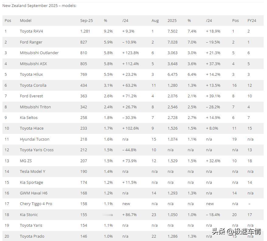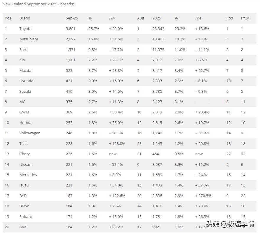 9月,新西兰车市延续高增长。名爵、长城、奇瑞、比亚迪等中国品牌的高增长与排名跃升,反映出中国汽车在新西兰市场的竞争力持续提升。中国汽车未来可期。 2025年9月,新西兰新车销量同比激增19.1%,至13,981辆。 2025年1-9月,新西兰累计销量同比增长7.4%,至100,795辆。 中国品牌表现: 名爵:375辆,第八名,市占率2.7%。 长城:369辆,第九名,市占率2.6%。 奇瑞:225辆,市占率1.6%。奇瑞集团销量369辆。 比亚迪:187辆,市占率1.3%。 上汽LDV:141辆,市占率1%。 奇瑞Jaecoo:74辆,市占率0.5%。 奇瑞Omoda:70辆,市占率0.5%。 零跑:37辆,市占率0.3%。 吉利:28辆,市占率0.2%。