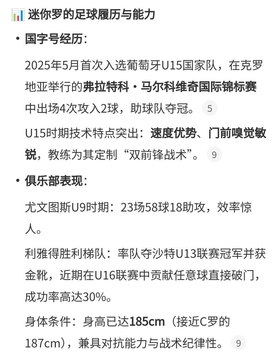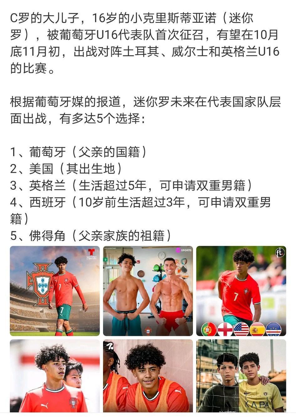 C罗大公子迷你罗入选葡萄牙U16国家队,我们期望的那个孩子真的长大了!踢不好只能回家继承亿万家产了。 迷你罗现年15岁,生于2010年6月,全名叫克里斯蒂亚诺・罗纳尔多・多斯・桑托斯。 迷你罗未来在代表国家队层面出战,有5个选择:葡萄牙、美国、英国、西班牙、佛得角。