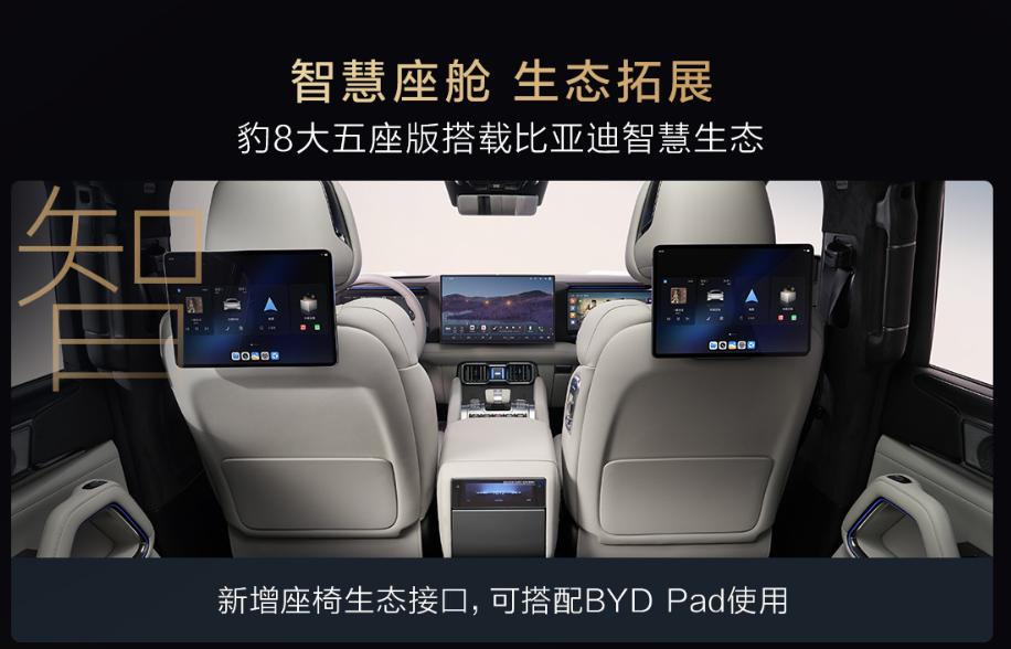 【售价37.98-39.98万,方程豹豹8大五座版上市】近日,比亚迪方程豹豹8大五座版正式上市,新车共推出2款配置,售价区间为37.98万-39.98万元。豹8大五座版后排配备带腿托零重力座椅,提升二排乘坐体验,并新增湖光绿外观配色。车内配备12.3英寸全液晶仪表+17.3英寸中控屏+12.3英寸副驾屏幕+50英寸AR-HUD的组合,支持多屏联动功能。豹8长宽高分别为5195/1994/1875mm,轴距为2920mm,此次上市的大五座版取消了三排座椅,车内的可用空间进一步拓展。动力方面,方程豹豹8采用DMO+插混平台,搭载2.0T发动机,与前200kW、后300kW驱动电机配合,综合输出功率可达550kW,系统扭矩可达760N·m;0-100km/h加速时间为4.8秒。它还拥有125km的纯电续航和1200km的综合续航,NEDC油耗为8.5L/100km,并且支持6kW外放电功能。【来自懂车帝车友圈】