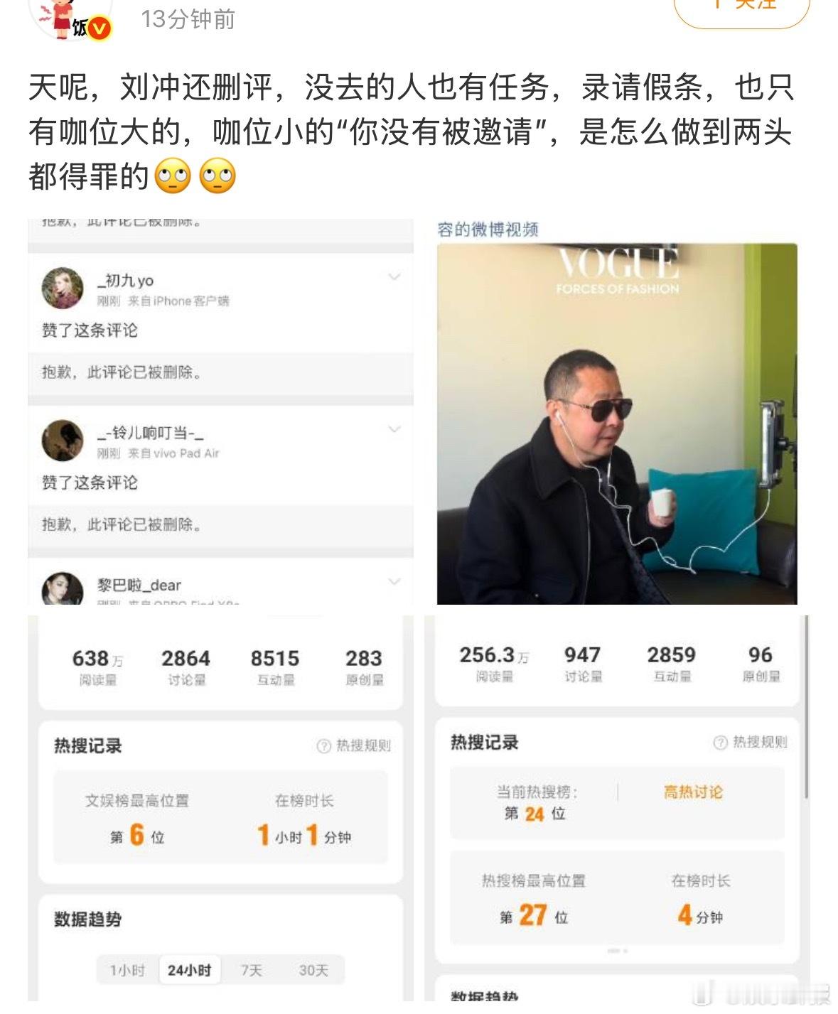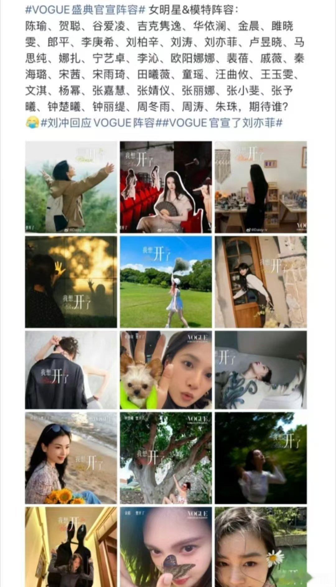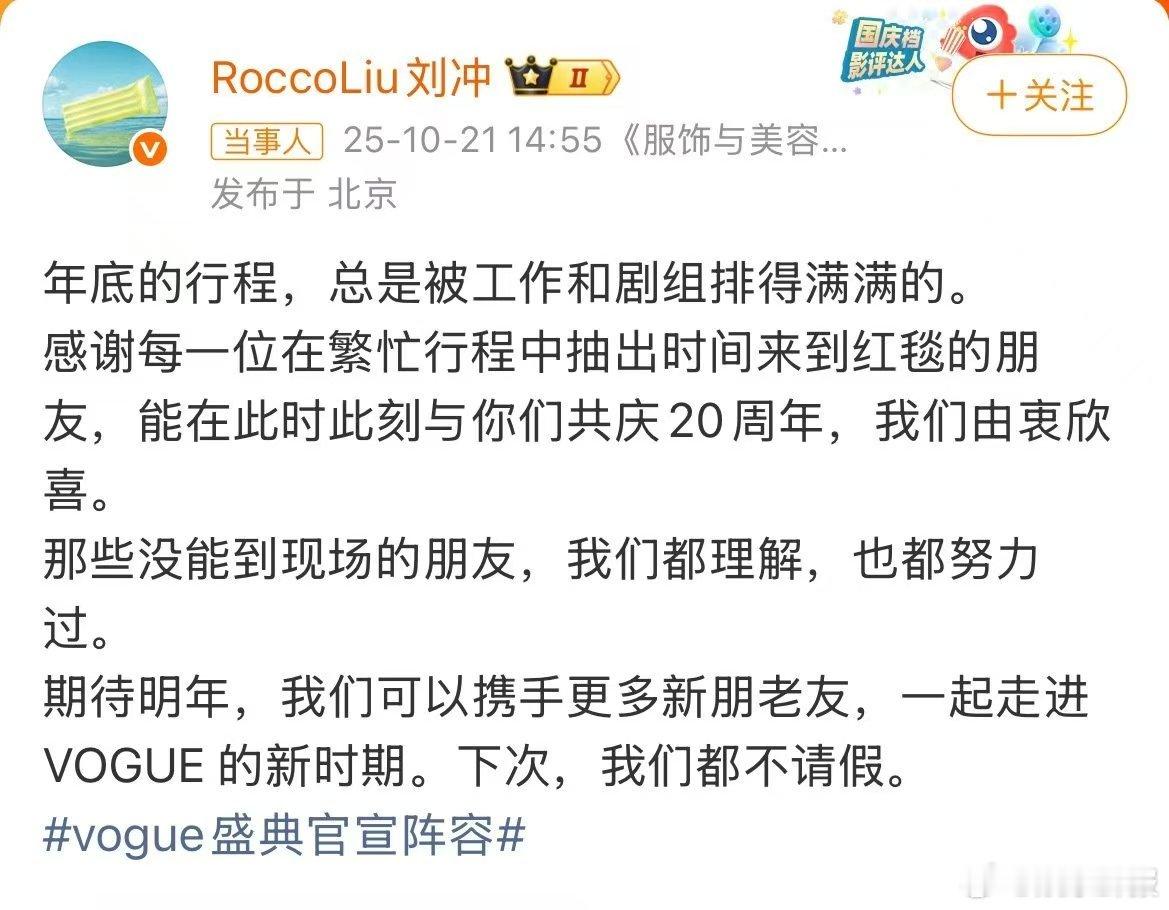 咖位小的没有被邀请 俺真的不中了,刘冲VOGUE20周年没来的艺人还需要录制请假视频,一篇小作文写的被网友称“得罪所有人”“咖位小的没有被邀请”……十一刷到宝了