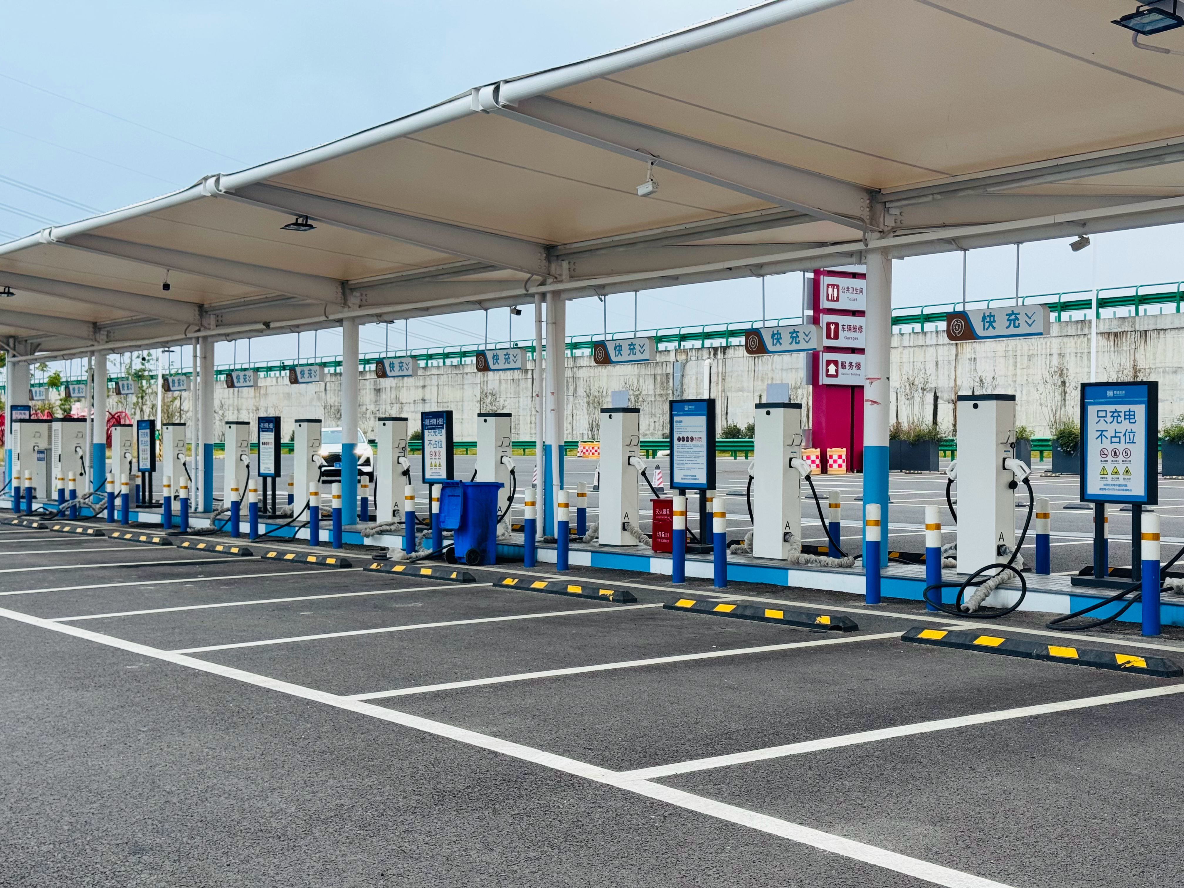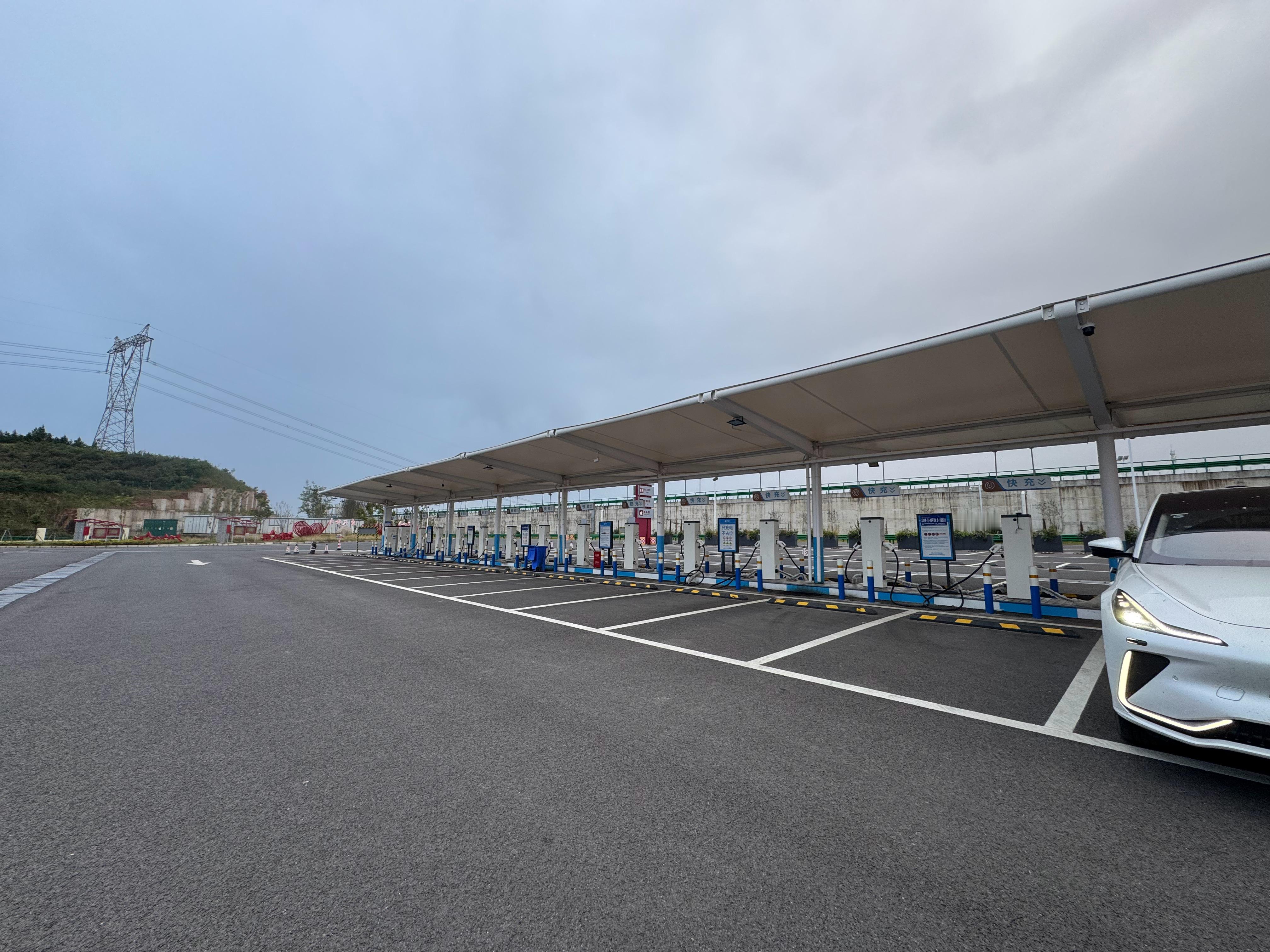然后关于充电,以往很多服务区,就4个桩,或者多点的8个桩,现在好多就直接20个充电桩,40个枪。包括今天停这个算少的,也有17个桩,34个枪。