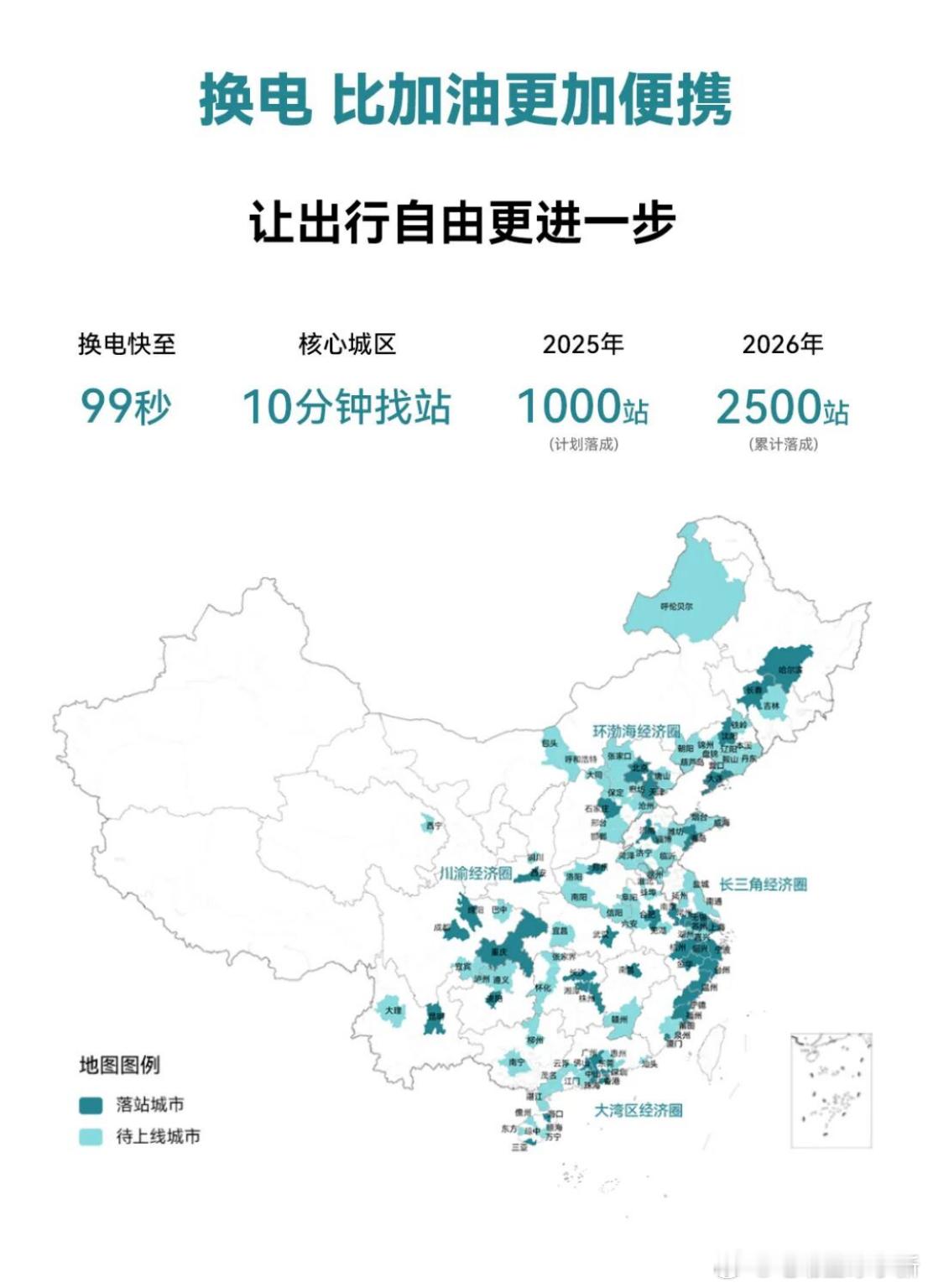 重庆、深圳、宁波、合肥、青岛、济南等11个城市已建成「核心城区 10 分钟找站,99 秒快换补能的换电自由区」;
