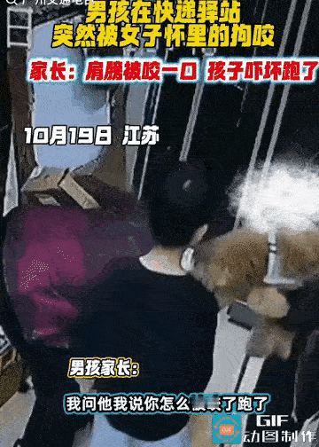 近日,江苏一女子抱泰迪狗取快递时,泰迪狗突咬伤身旁男孩肩膀!女子轻拍“施暴犬”