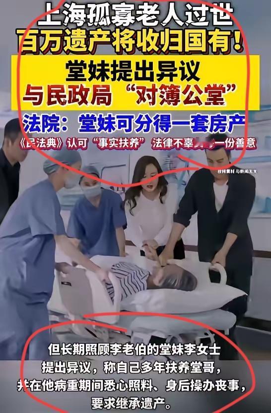 上海一孤寡老人去世! 没结婚也没孩子,百万遗产本来要被收归国有!结果堂妹 打官司把民政局告了,最后还拿到了房产,这事儿太让人暖心了! 很多人觉得“不是法定继承人就没资格”,但法律早把“真心付出”算进了考量里。李女士没血缘却多年照料,端茶倒水、操办丧事,这些实打实的付出,被《民法典》稳稳接住了。 这哪儿是分遗产,分明是法律在给善良撑腰——它告诉我们,不图回报的照料从不是白费力气。 现在孤寡老人不少,能有人真心相待多难得?这个判决不仅公平,更给了好人一个定心丸。 你觉得这个结果能鼓励更多人善待身边老人吗?来评论区聊聊~