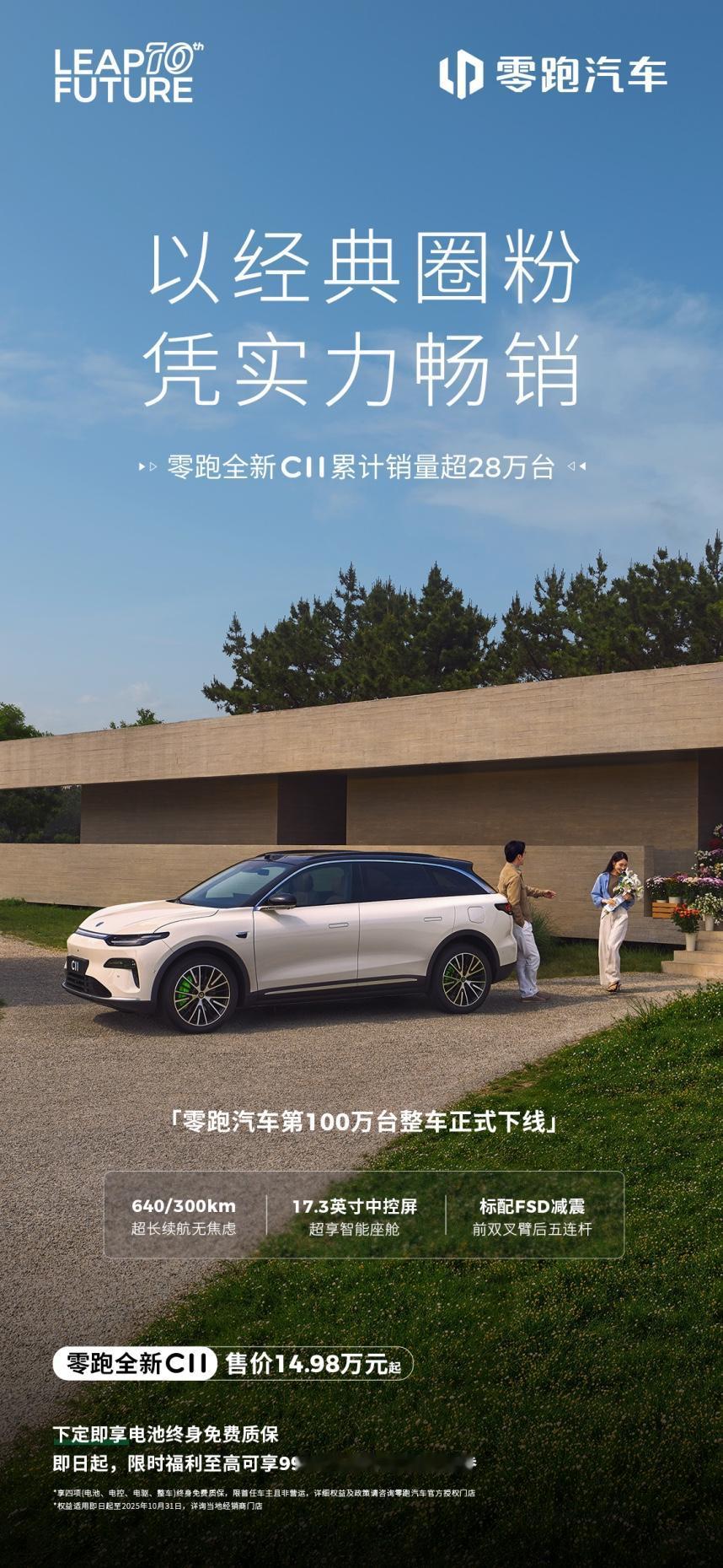 零跑周销量持续稳定,新增订单破万,交付达1.3万! 如今已经逐渐接近年底,各家车企也都开始了最后的年底冲刺。不过我想有一家车企却不需要太着急,它就是零跑。作为如今新势力的销量第一,零跑的销量可以说是“量稳质优”的典范。比如最新的周销量数据,零跑新增订单突破了1万台,实际交付量更是达到1.3万辆,这个交付量不出意外,应该是新势力周销第一。 可以说,健康的订单与交付比例,不仅可以让经销商保持不足一个月的健康库存,也凸显了零跑高效的产销协同能力和稳健的经营状态;而且交付的稳定,也是企业长期竞争力的硬核体现,更说明零跑的产品能够精准地覆盖大众市场。 就拿零跑旗下销量担当C11来说,该车主打15万左右地中型SUV市场,累计交付已突破28万台,口碑常年稳居中型新能源SUV第一名,特别是全新C11的上市,凭借其8295芯片、激光雷达端到端辅助驾驶、640km续航+800V快充等越级配置,确实是普通大众家庭购车用车地不错选择。 如今,零跑年底大促销已经开始了,现在购买零跑车型可享受最高9000元的置换补贴以及诸多终身质保等权益等。而且听说明年1月1日开始,购置税减免政策就要开始退坡了,30万以内车购置税最多减免一半,相当于现在就买C11的话,比明年再买能够省下1万块钱左右,差不多够你两年的充电费了。所以零跑现在大促加上政策最后的红利期,可以说现在就是入手零跑的最佳时刻,年底有用车需求的朋友,真的可以认真考虑!零跑汽车