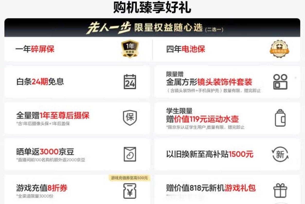 然后京东这上面,送一年碎屏保或者四年电池保,还有1年至尊后摄保,含后盖和后置镜头的。首销也有方形镜头盖和保护壳附赠。再加其他杂七杂八,24期免息。